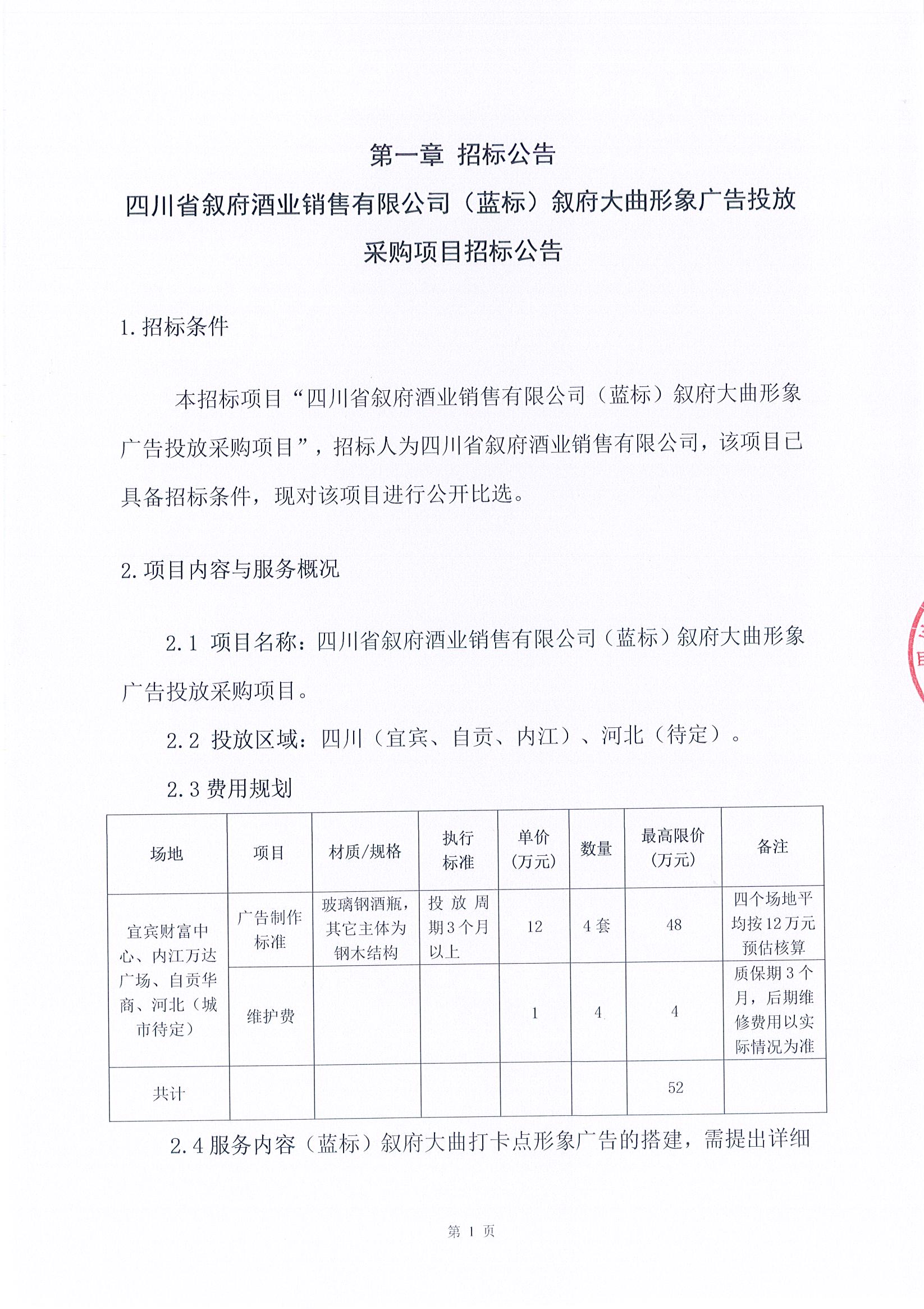 四川省敘府酒業(yè)銷(xiāo)售有限公司(藍標)敘府大曲形象廣告投放采購項目公開(kāi)比選公示公告