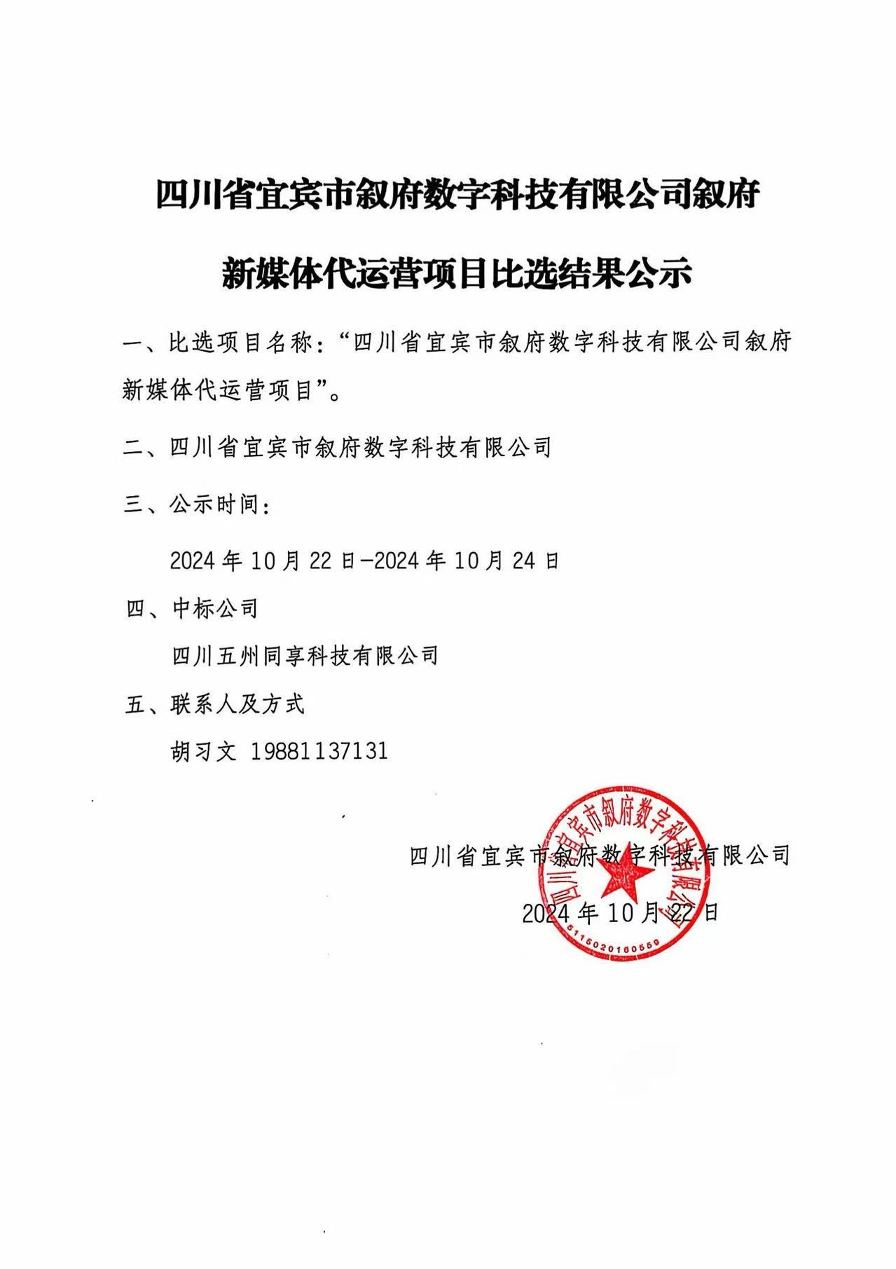 四川省宜賓市敘府數字科技有限公司敘府 新媒體代運營(yíng)項目比選結果公示