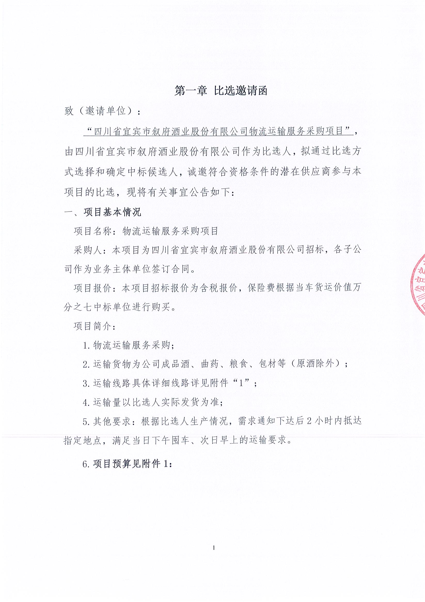 四川省宜賓市敘府酒業(yè)股份有限公司物流運輸服務(wù)采購項目比選公示公告