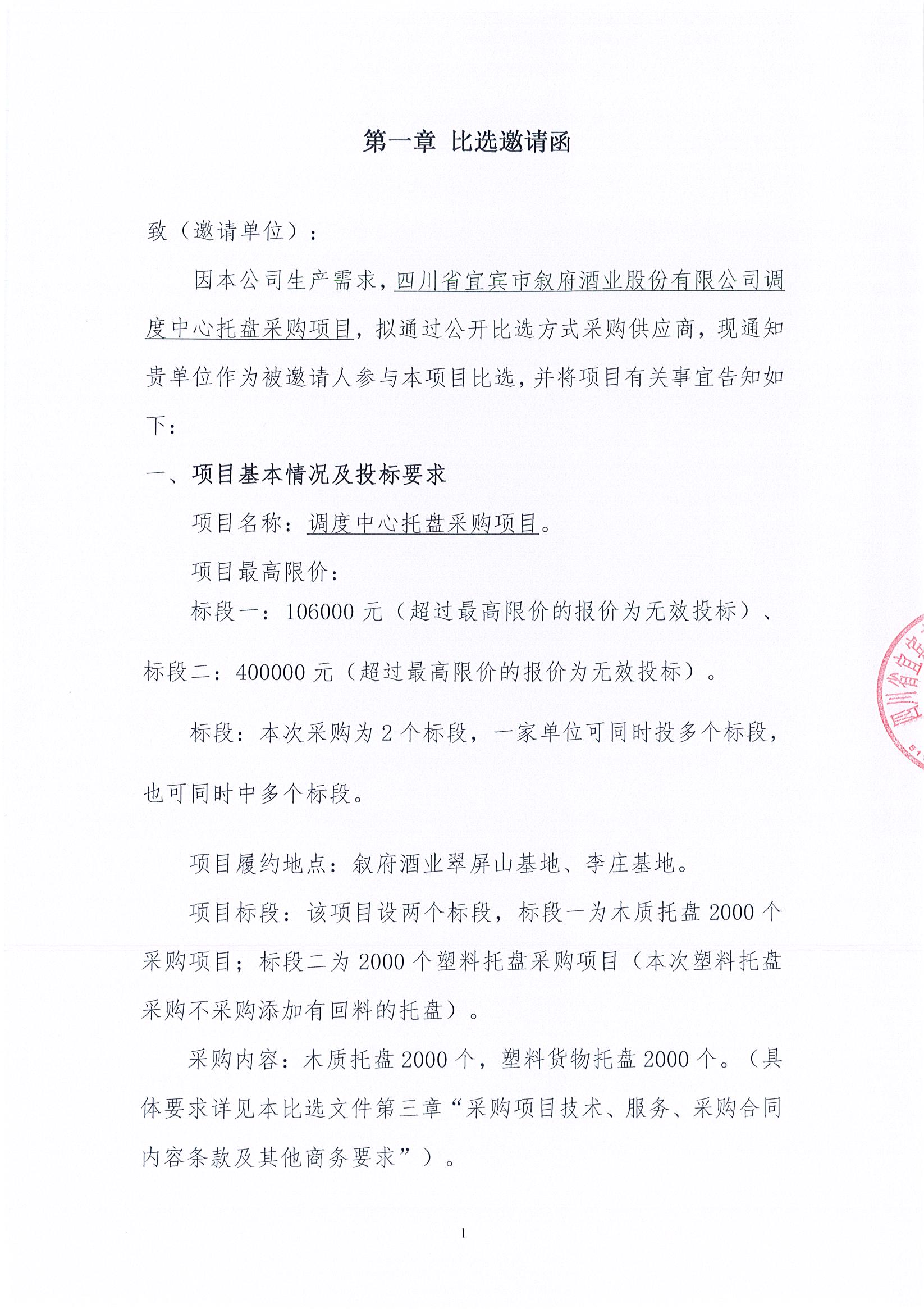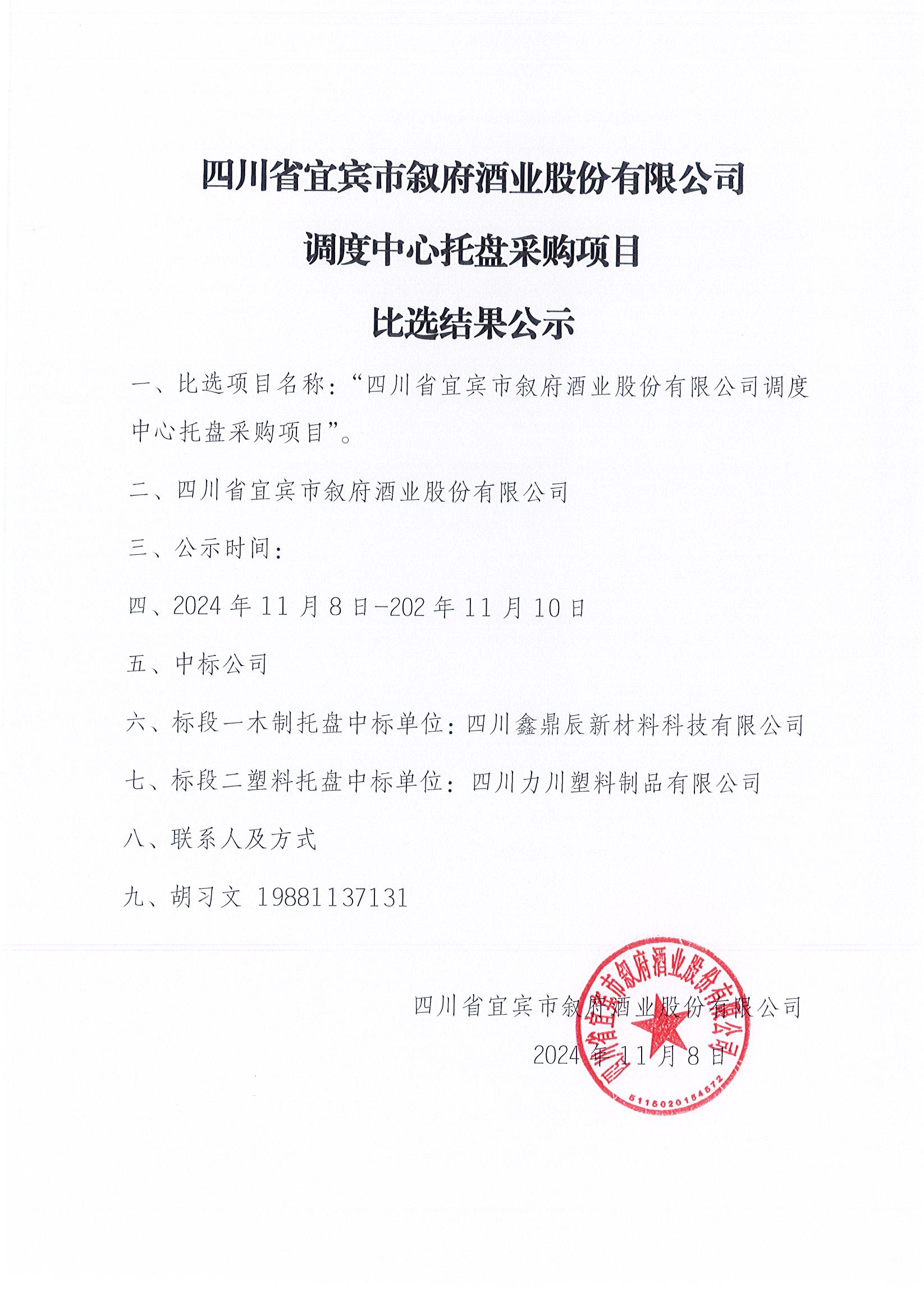 四川省宜賓市敘府酒業(yè)股份有限公司調度中心托盤(pán)采購項目比選公示公告