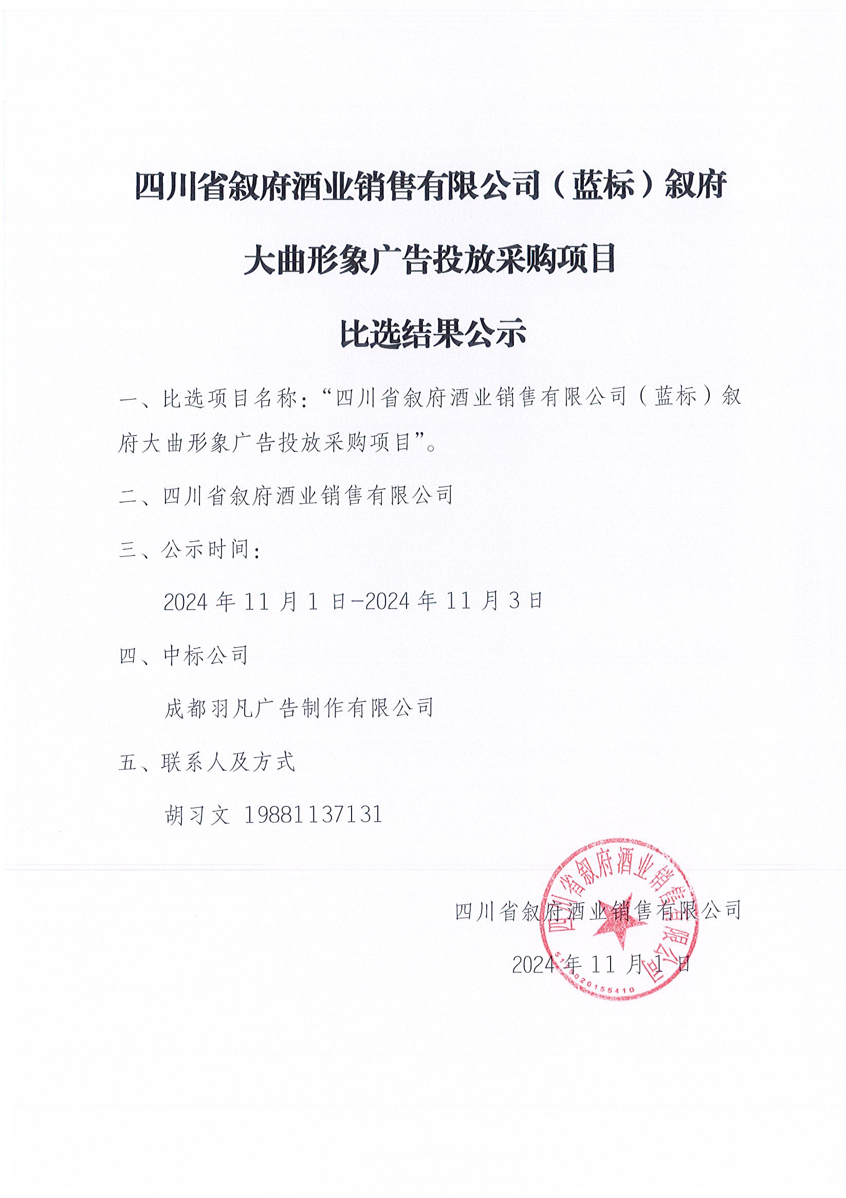 四川省敘府酒業(yè)銷(xiāo)售有限公司(藍標)敘府大曲形象廣告投放采購項目比選結果公示