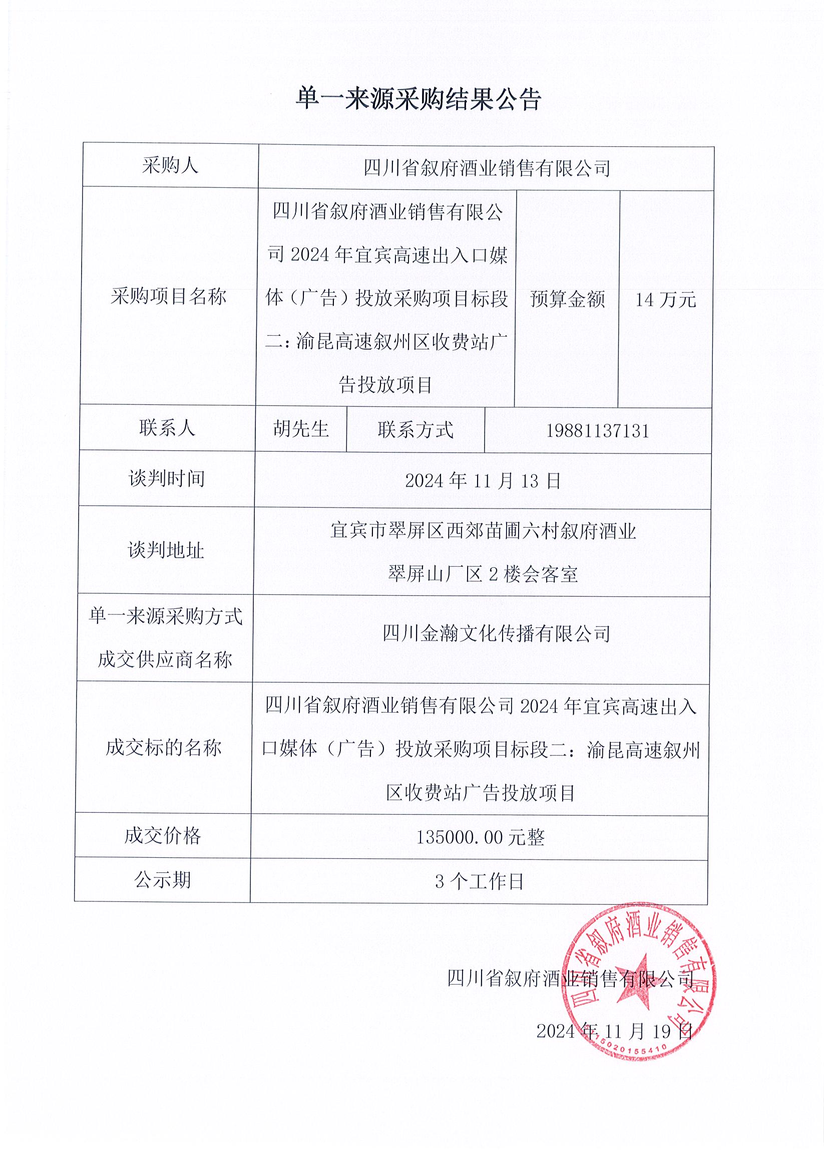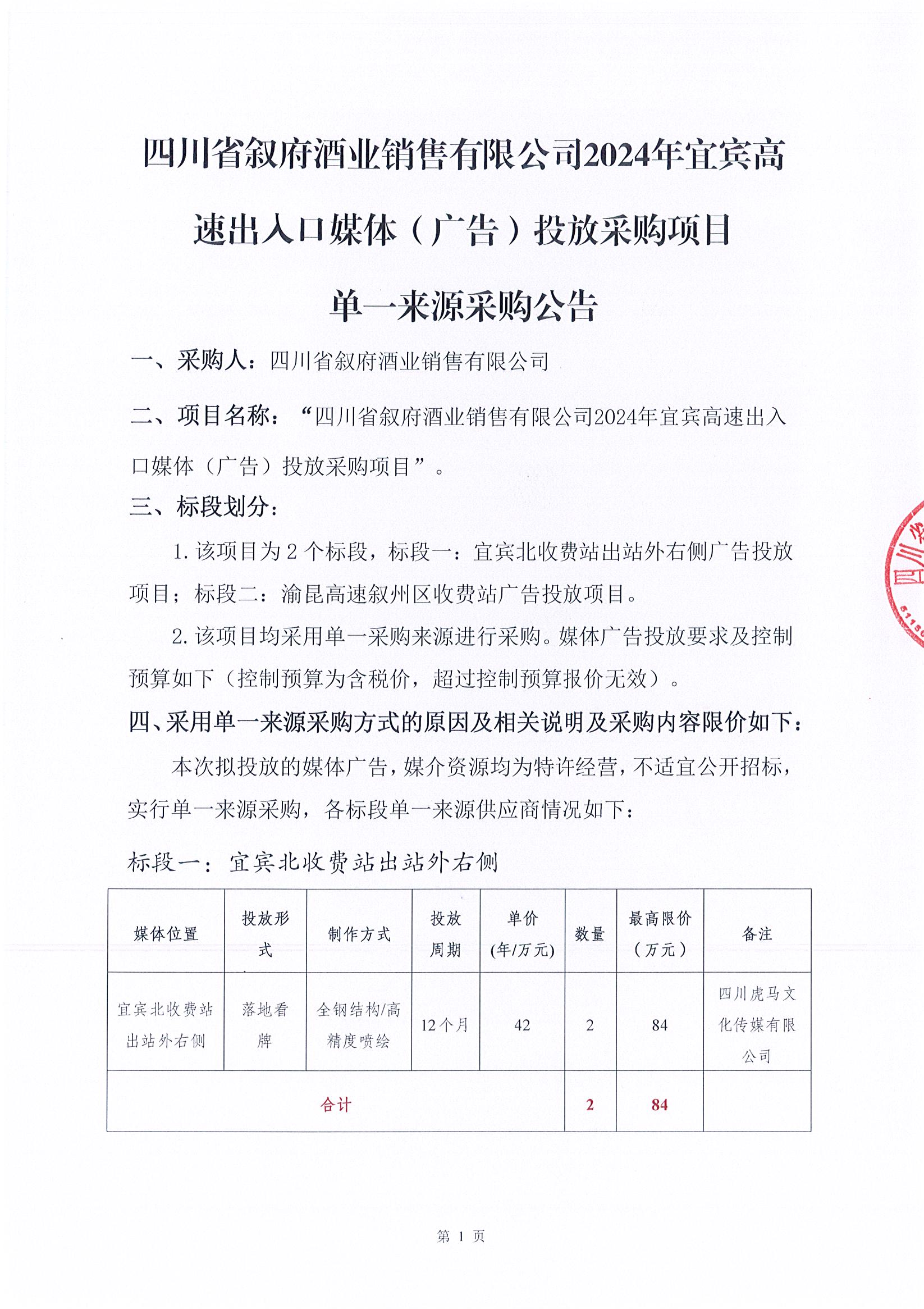 四川省敘府酒業(yè)銷(xiāo)售有限公司2024年宜賓高速出入口媒體(廣告)投放采購項目單一來(lái)源公示公告