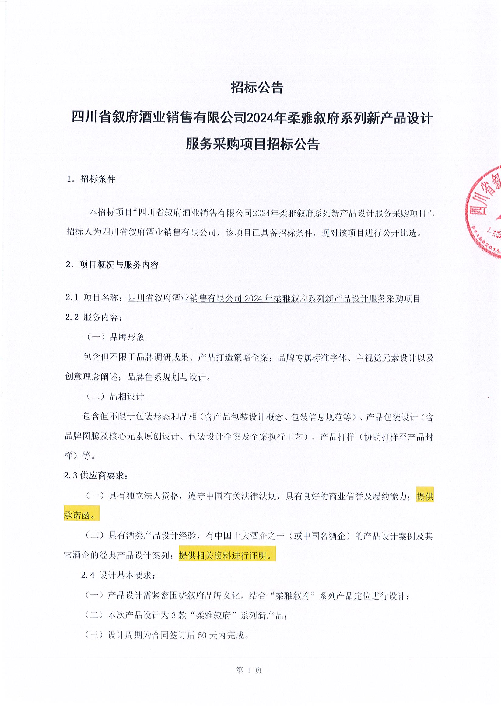 四川省敘府酒業(yè)銷(xiāo)售有限公司2024年柔雅敘府系列新產(chǎn)品設計服務(wù)采購項目招標公示公告