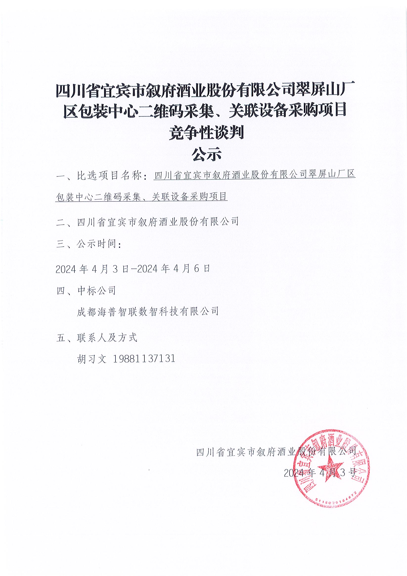 四川省宜賓市敘府酒業(yè)股份有限公司翠屏山廠(chǎng)區包裝中心二維碼采集、關(guān)聯(lián)設備采購項目 競爭性談判中標 結果公示