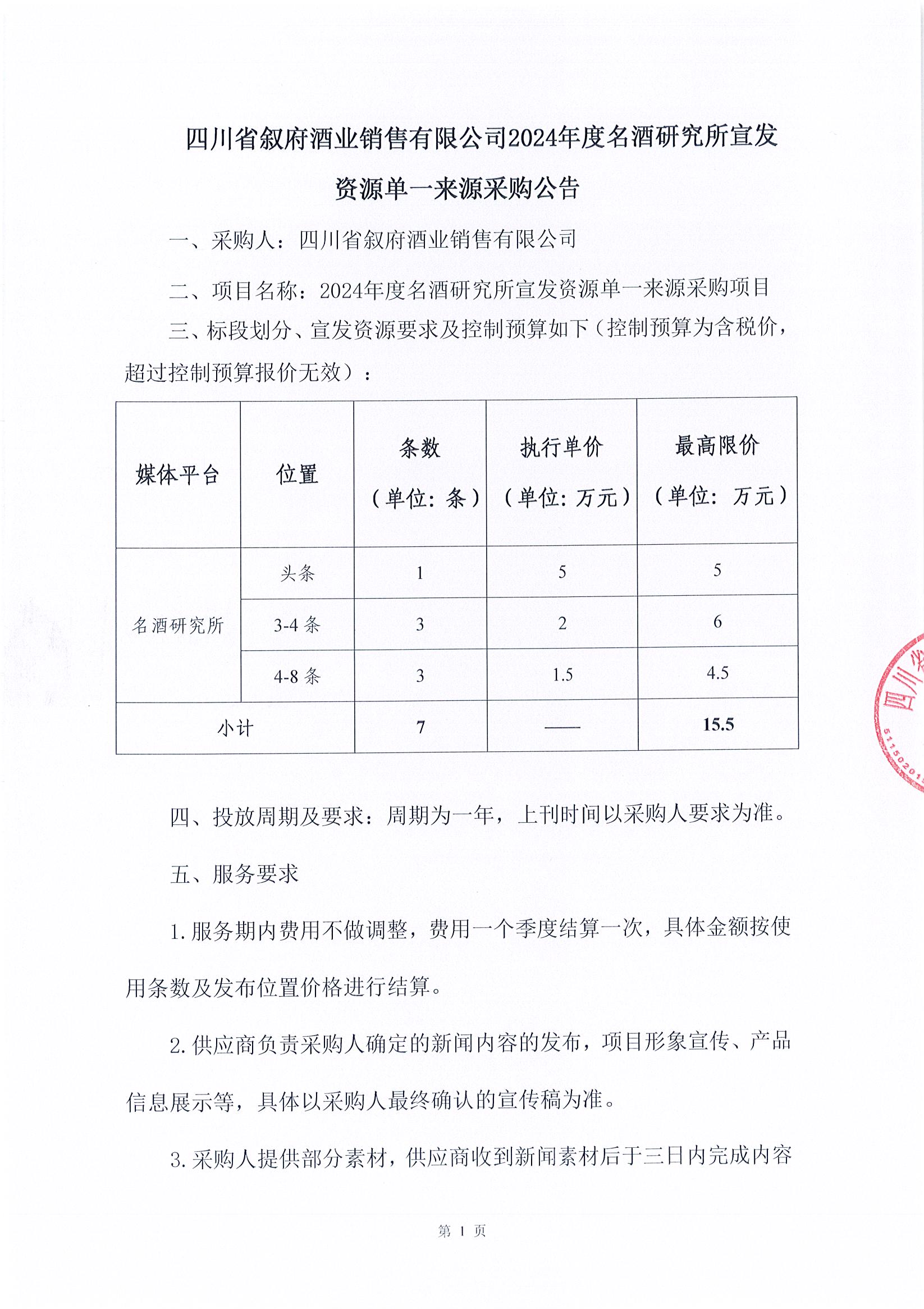四川省敘府酒業(yè)銷(xiāo)售有限公司2024年度名酒研究所宣發(fā)資源單一來(lái)源采購項目公示公告