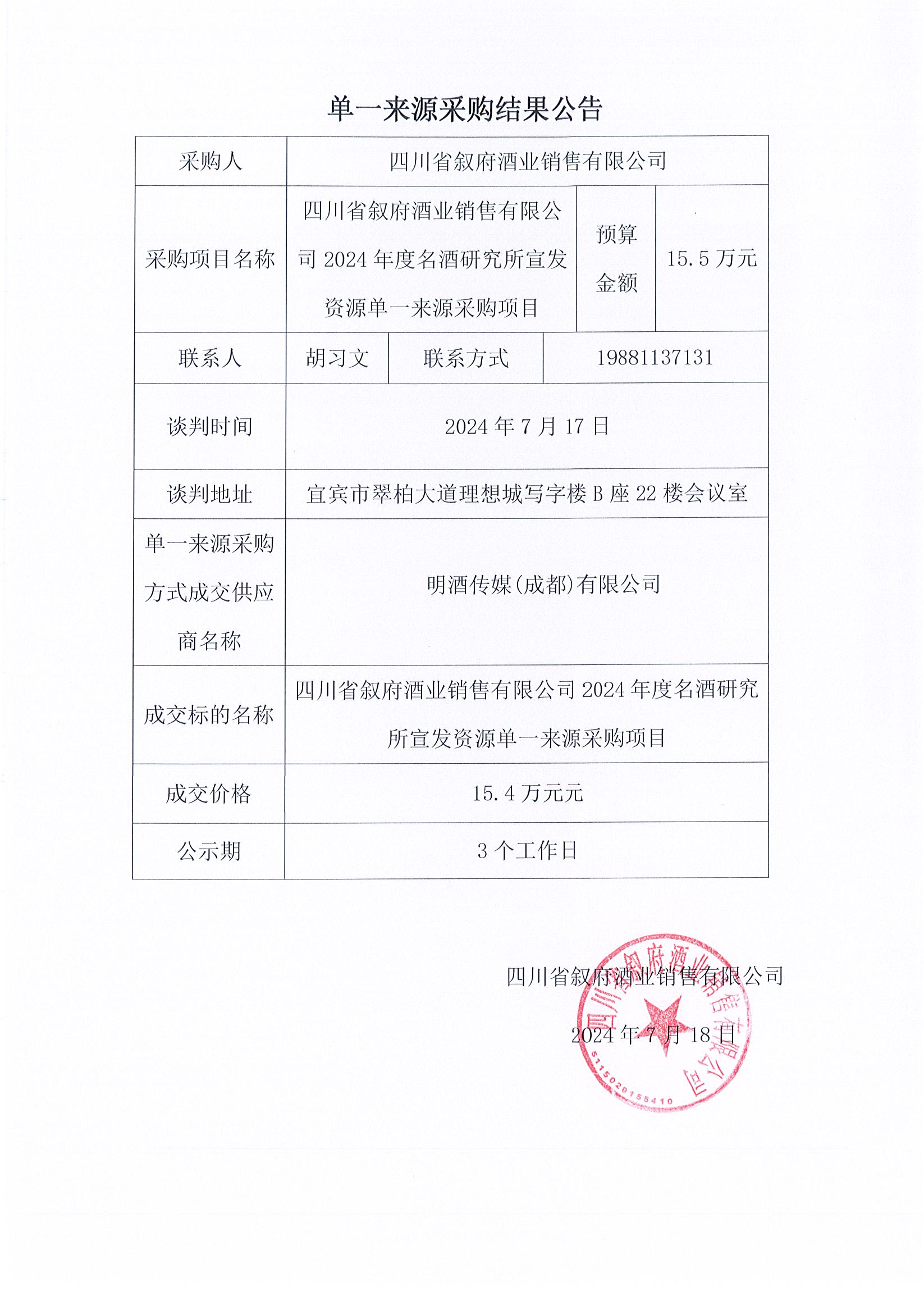 四川省敘府酒業(yè)銷(xiāo)售有限公司2024年度名酒研究所宣發(fā)資源單一來(lái)源采購項目中標結果公示公告