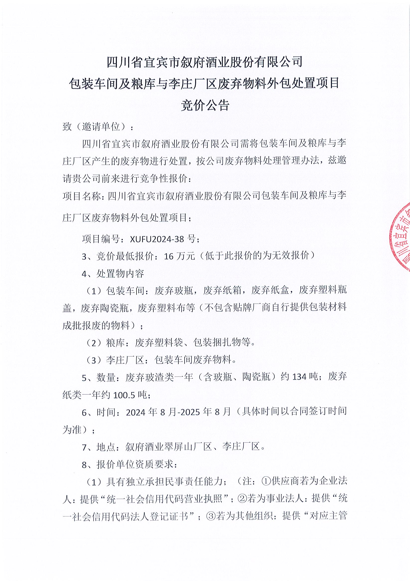 四川省宜賓市敘府酒業(yè)股份有限公司 包裝車(chē)間及糧庫與李莊廠(chǎng)區廢棄物料外包處置項目 競價(jià)公告