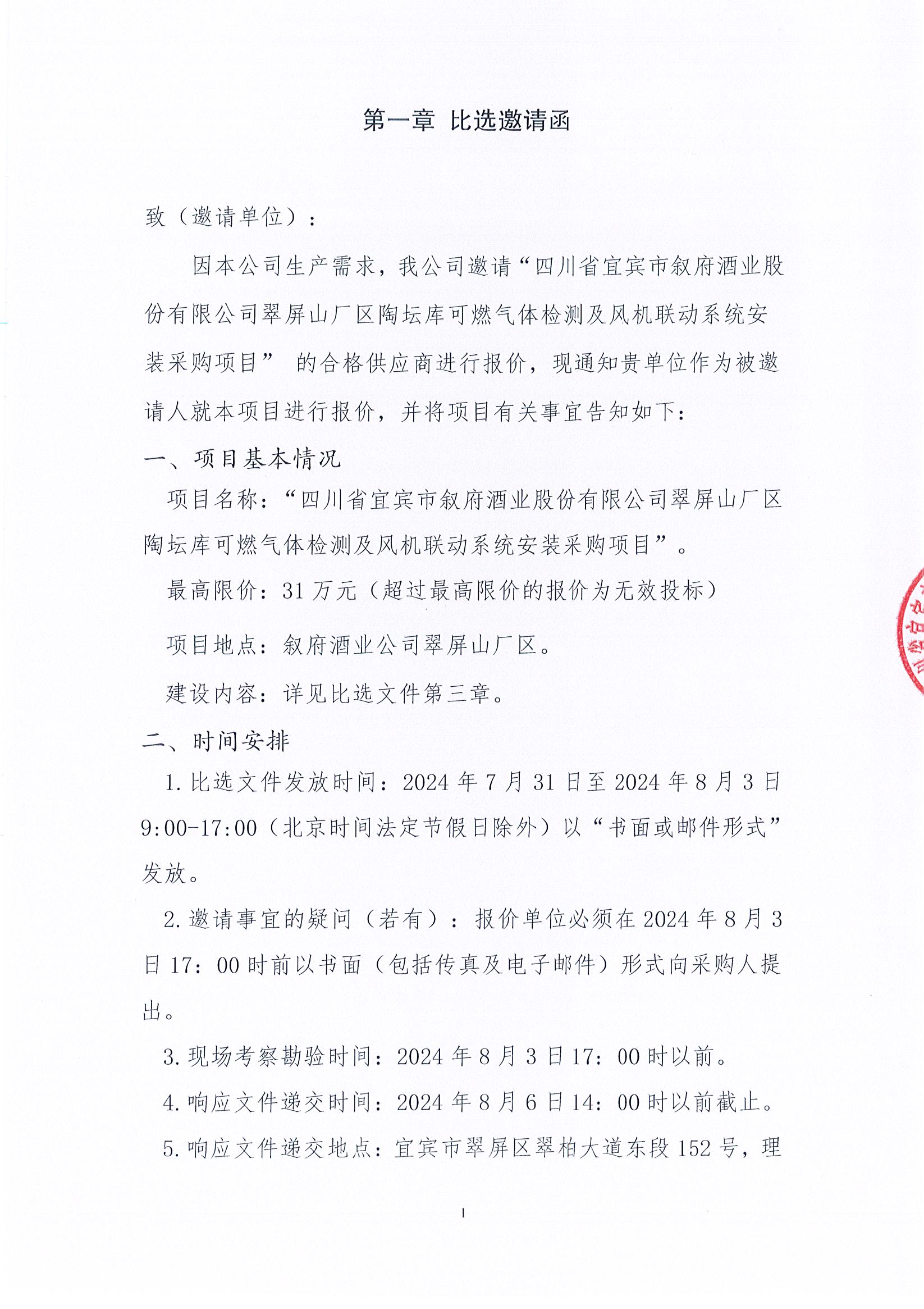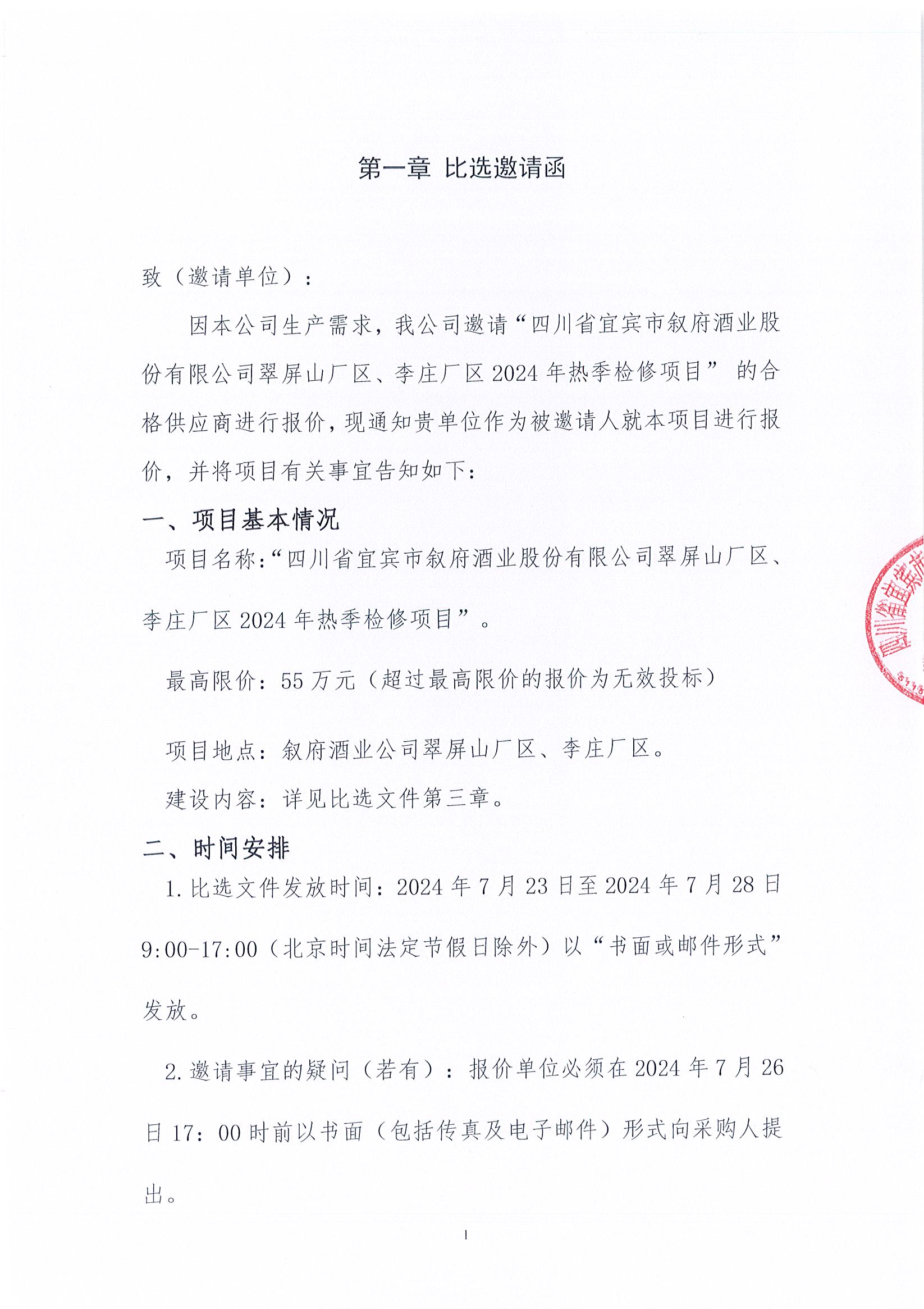 四川省宜賓市敘府酒業(yè)股份有限公司翠屏山廠(chǎng)區、李莊廠(chǎng)區2024年熱季檢修項目公開(kāi)比選公示公告