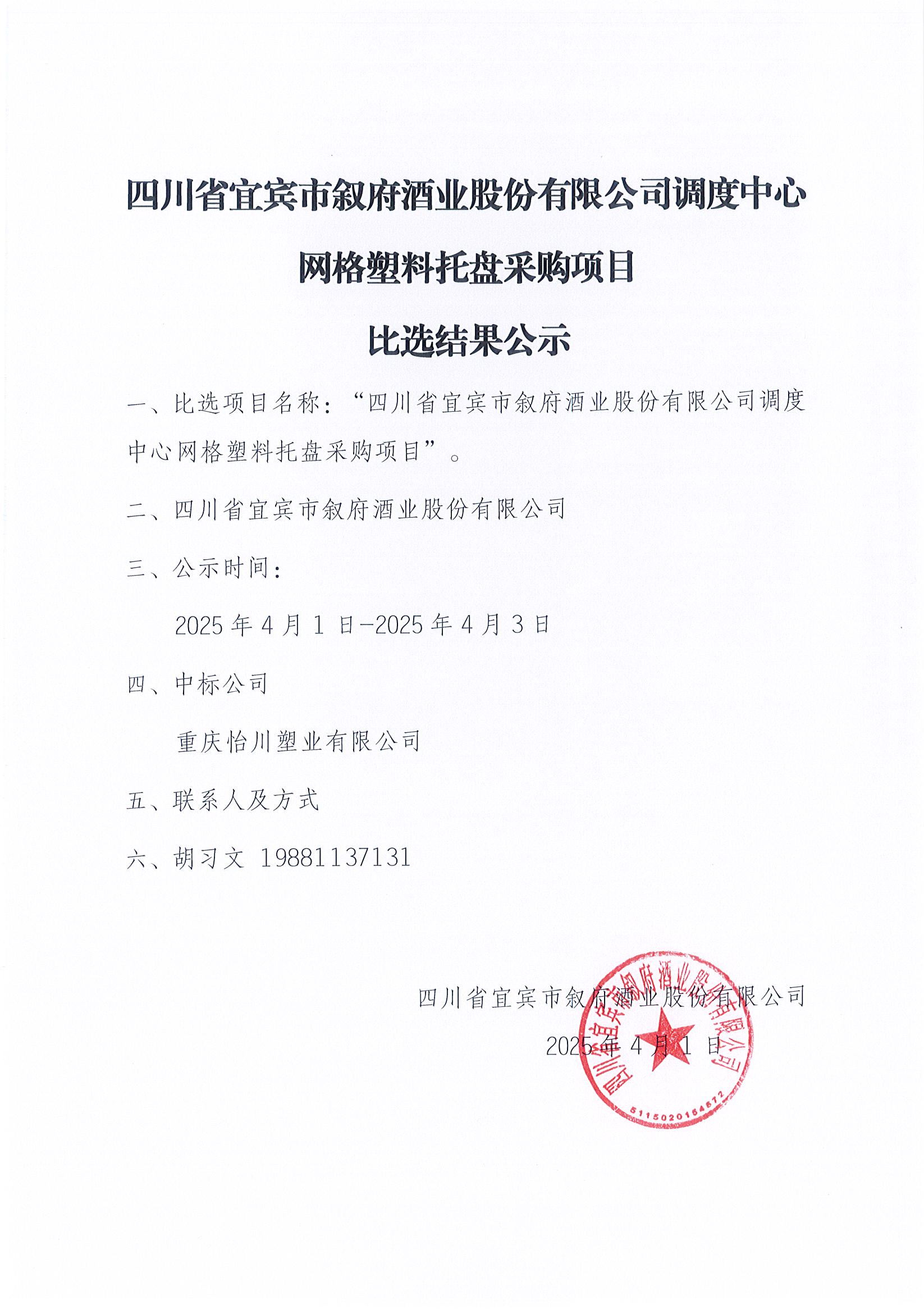 四川省宜賓市敘府酒業(yè)股份有限公司調度中心網(wǎng)格塑料托盤(pán)采購項目公開(kāi)比選結果公示