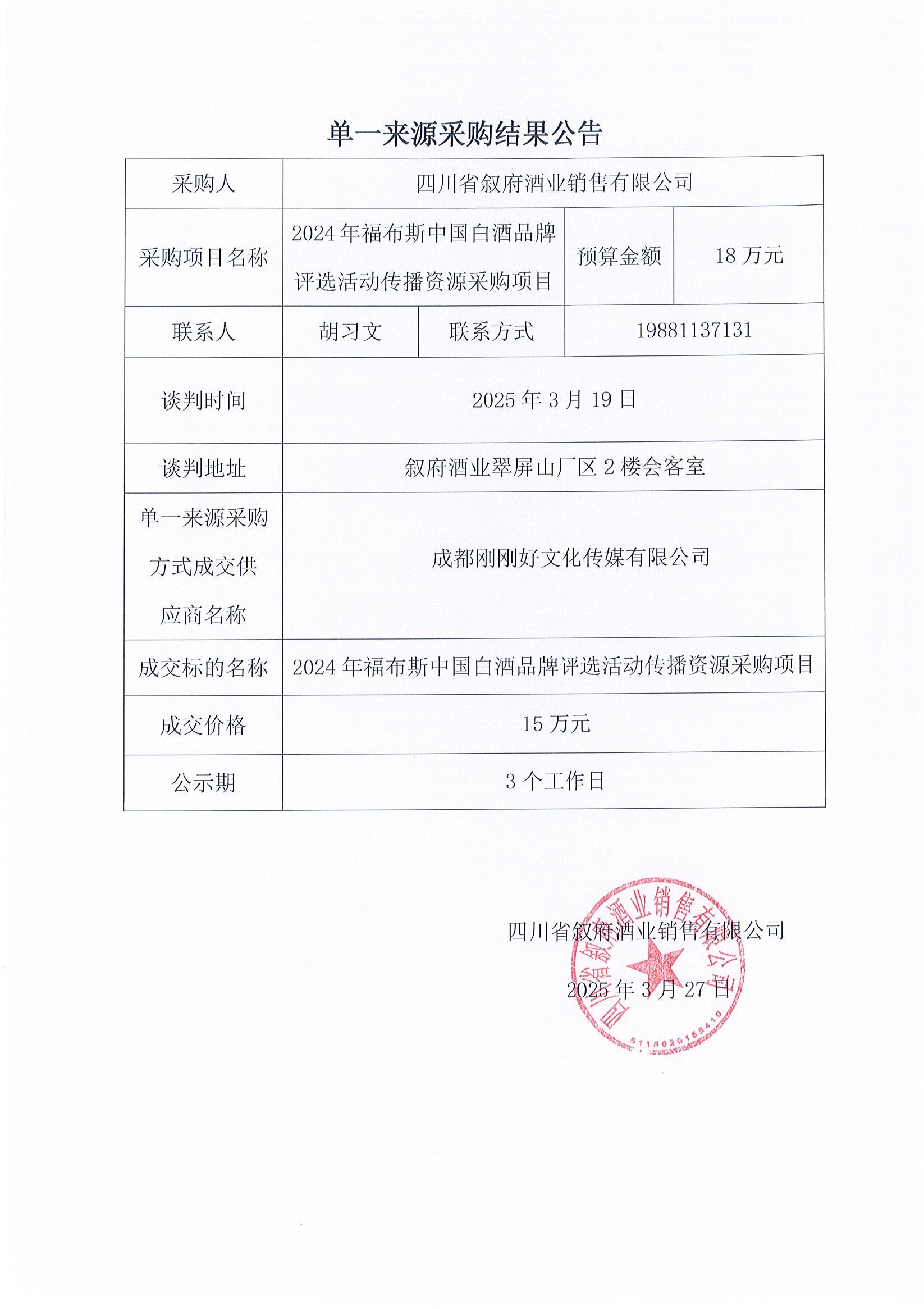 四川省敘府酒業(yè)銷(xiāo)售有限公司2024年福布斯中國白酒品牌評選活動(dòng)傳播資源采購項目單一來(lái)源結果公示