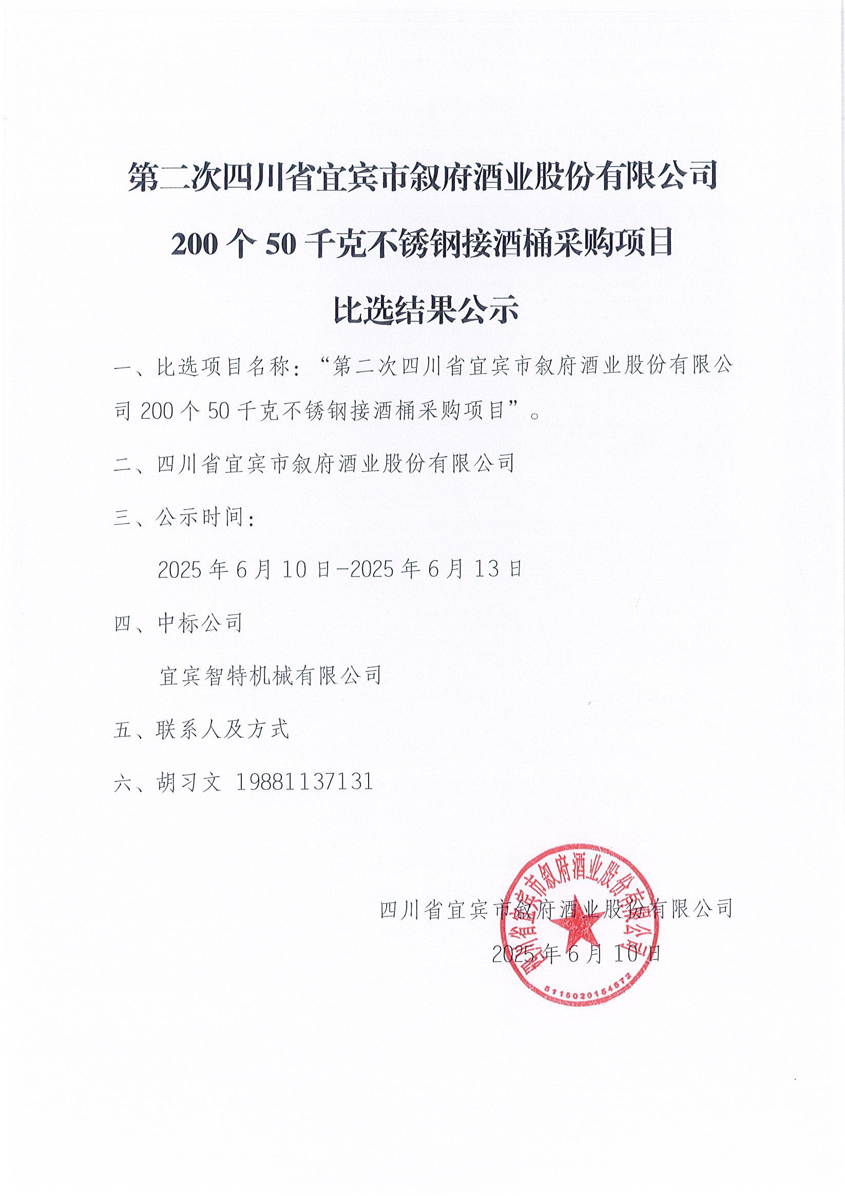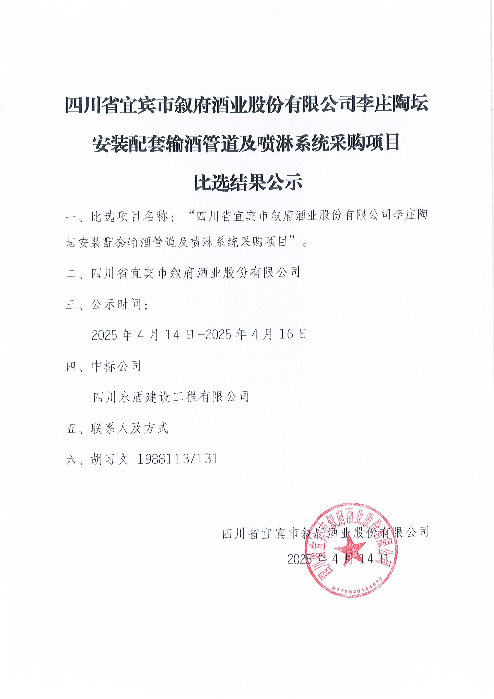 四川省宜賓市敘府酒業(yè)股份有限公司李莊陶壇安裝配套輸酒管道及噴淋系統采購項目比選結果公告