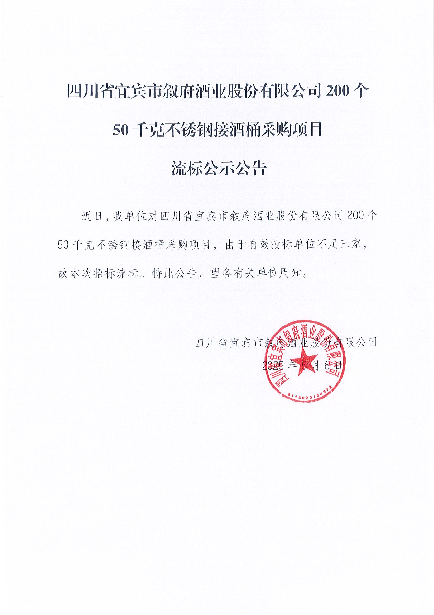 四川省宜賓市敘府酒業(yè)股份有限公司200個(gè)50千克不銹鋼接酒桶采購項目流標公示公告