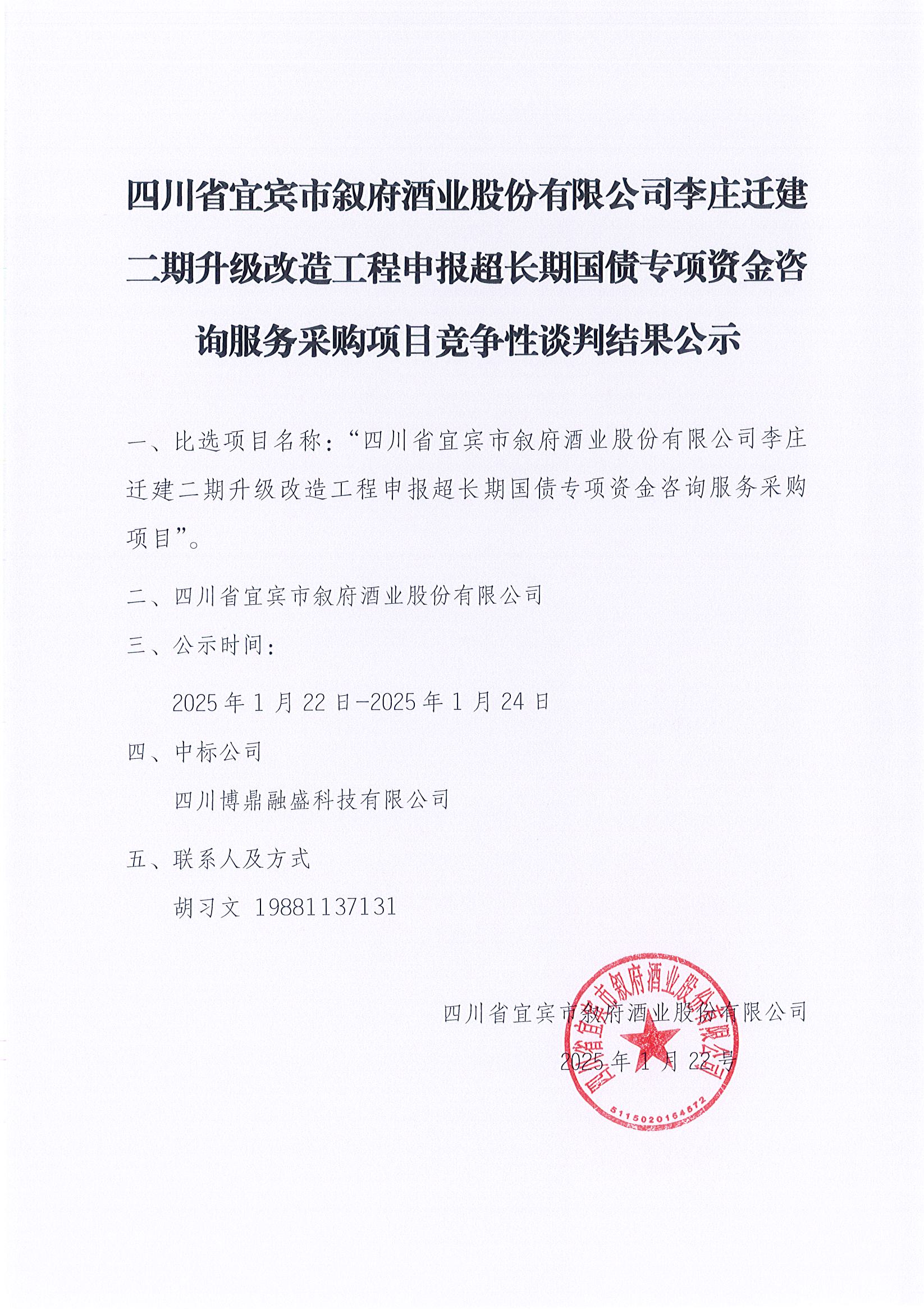 四川省宜賓市敘府酒業(yè)股份有限公司李莊遷建二期升級改造工程申報超長(cháng)期國債專(zhuān)項資金咨詢(xún)服務(wù)采購項目競爭性談判結果公示公告