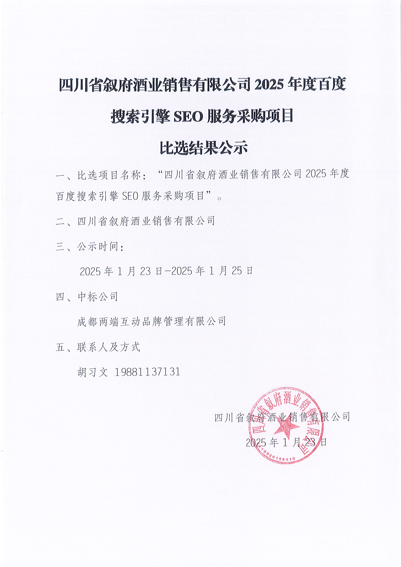 四川省敘府酒業(yè)銷(xiāo)售有限公司2025年度百度搜索引擎SEO服務(wù)采購項目比選結果公示公告