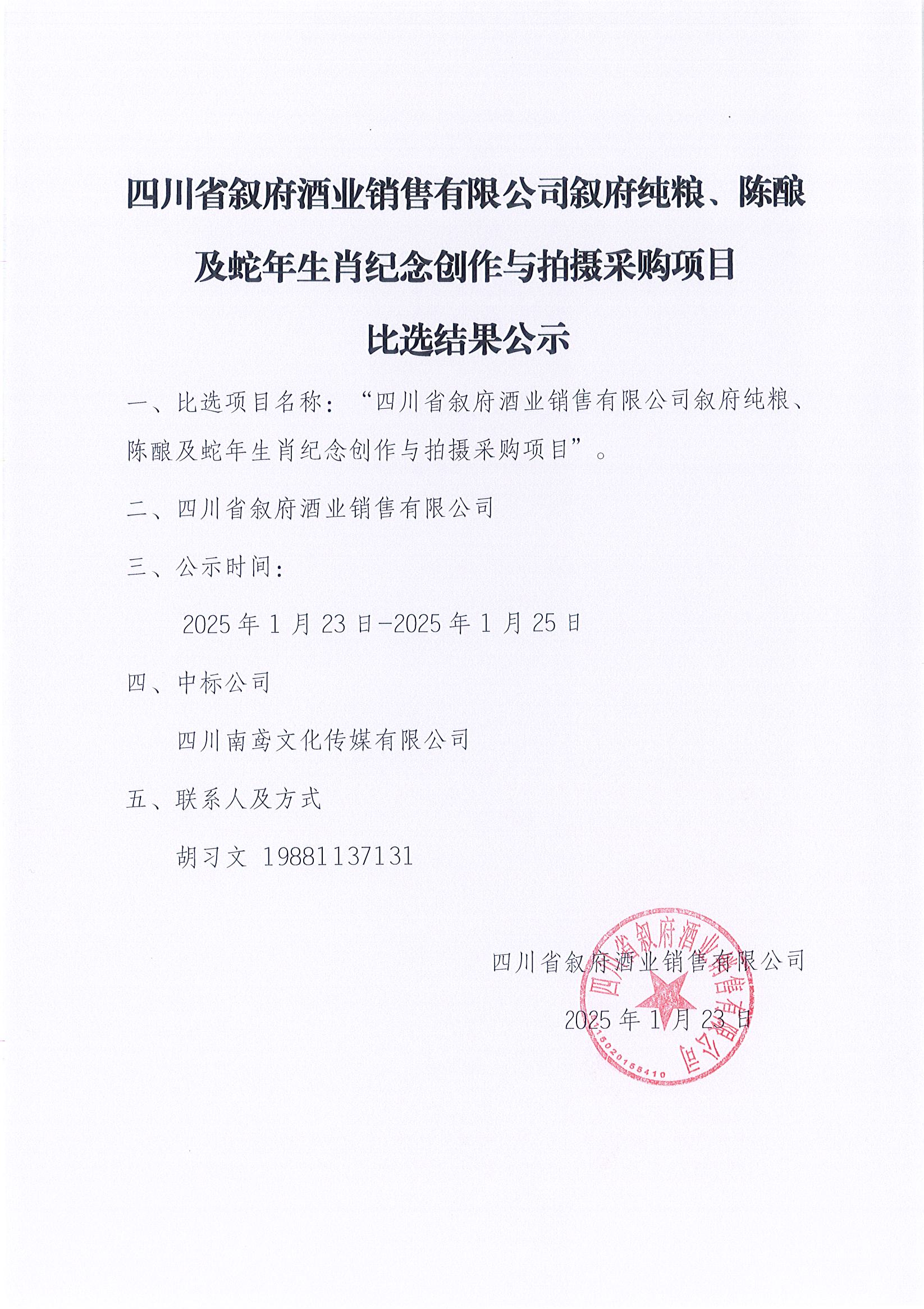 四川省敘府酒業(yè)銷(xiāo)售有限公司敘府純糧、陳釀及蛇年生肖紀念創(chuàng )作與拍攝采購項目比選結果公示公告