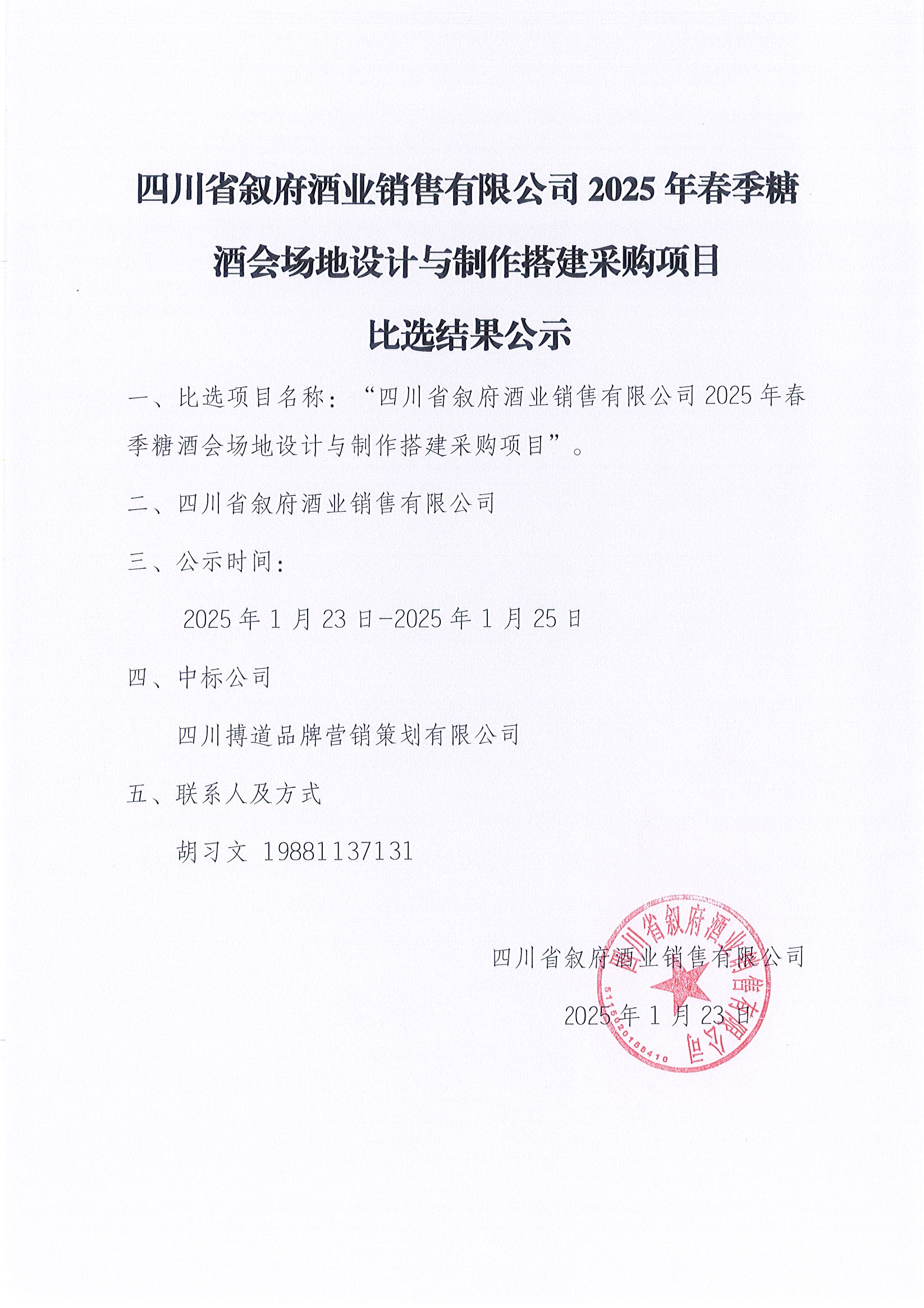 四川省敘府酒業(yè)銷(xiāo)售有限公司2025年春季糖酒會(huì )場(chǎng)地設計與制作搭建采購項目比選結果公示公告