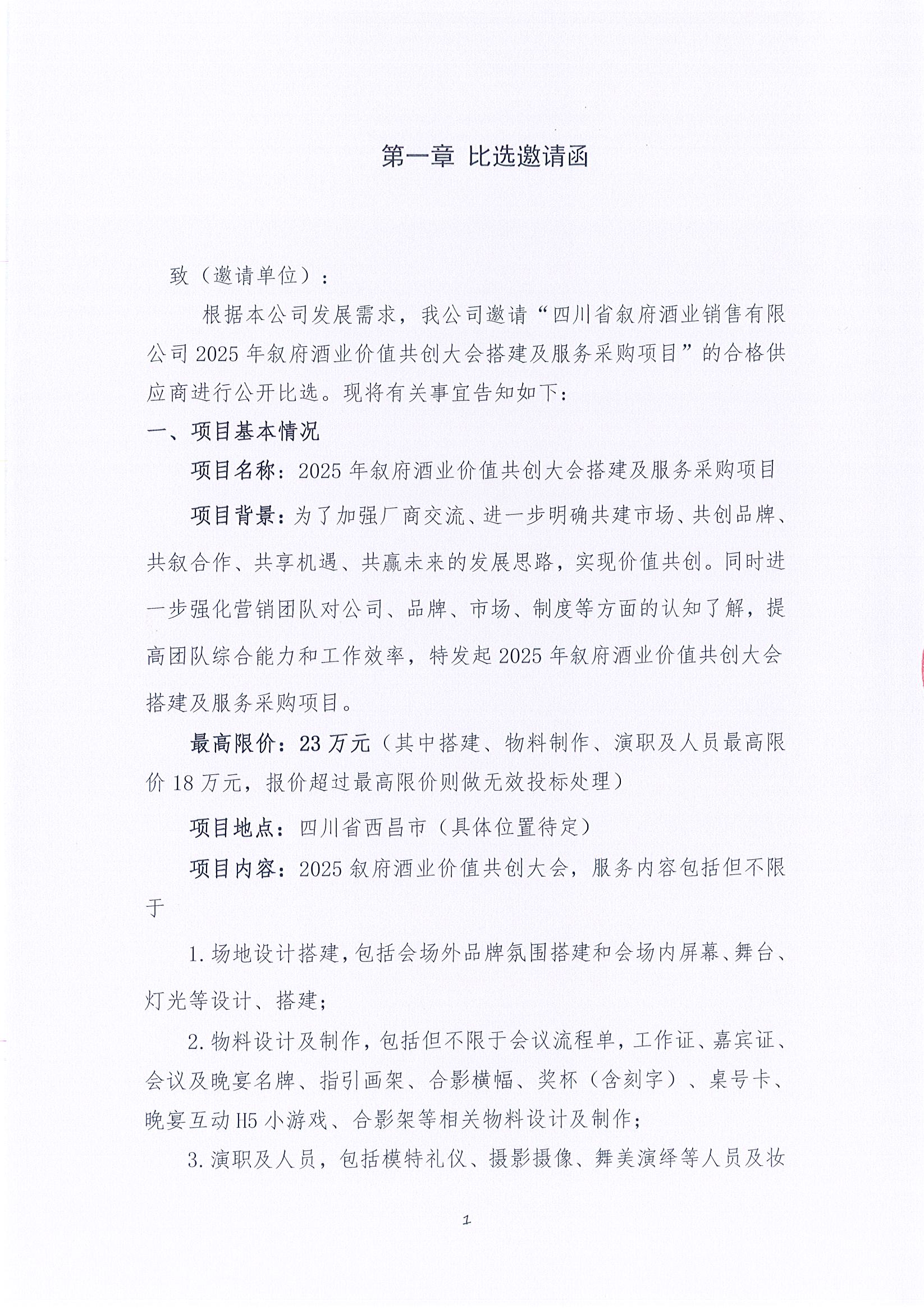 四川省敘府酒業(yè)銷(xiāo)售有限公司2025年敘府酒業(yè)價(jià)值共創(chuàng )大會(huì )搭建及服務(wù)采購項目比選邀請函