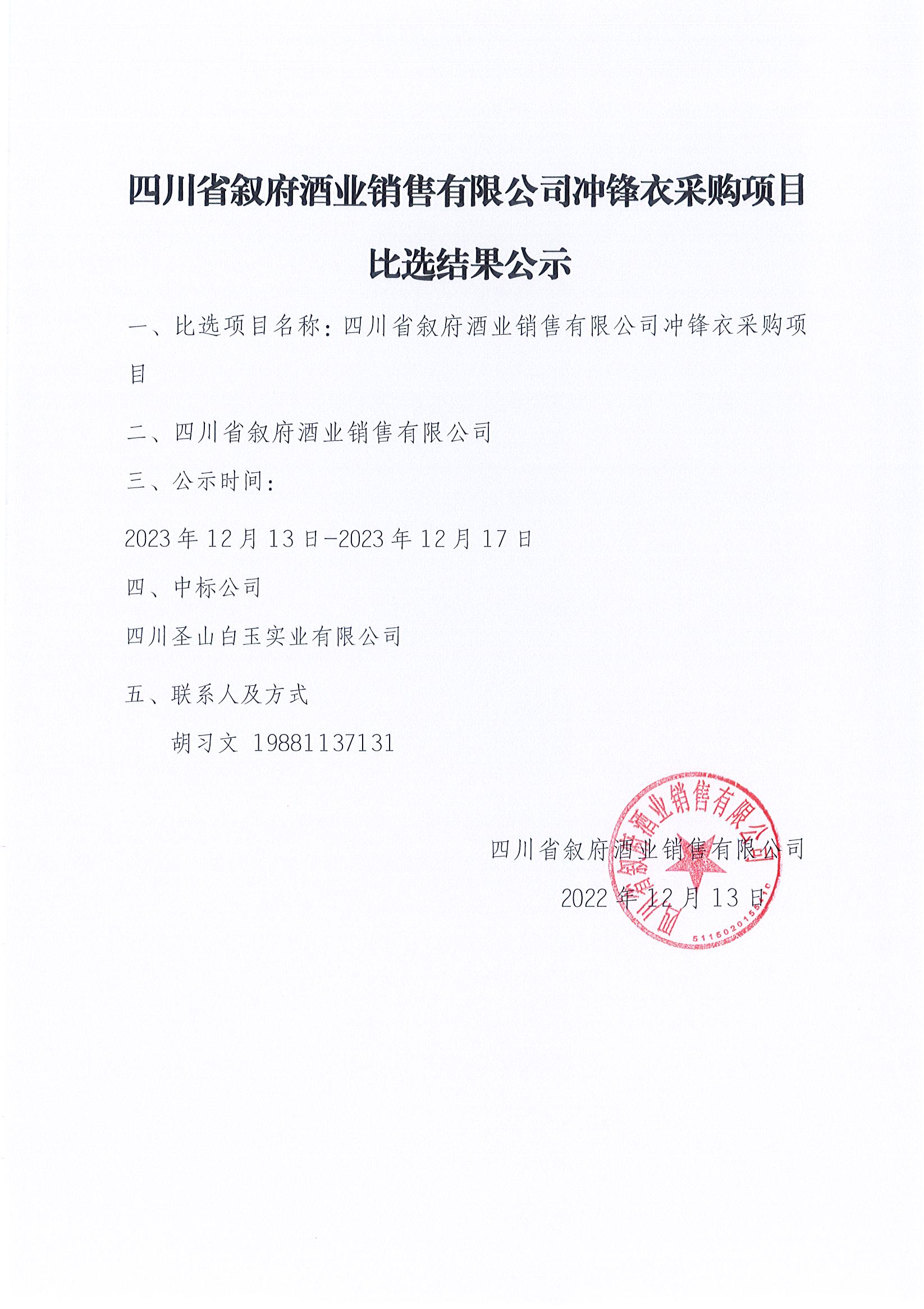 四川省敘府酒業(yè)銷(xiāo)售有限公司敘府大曲(藍標)產(chǎn)品TVC的創(chuàng )作與拍攝采購項目中標結果公示公告