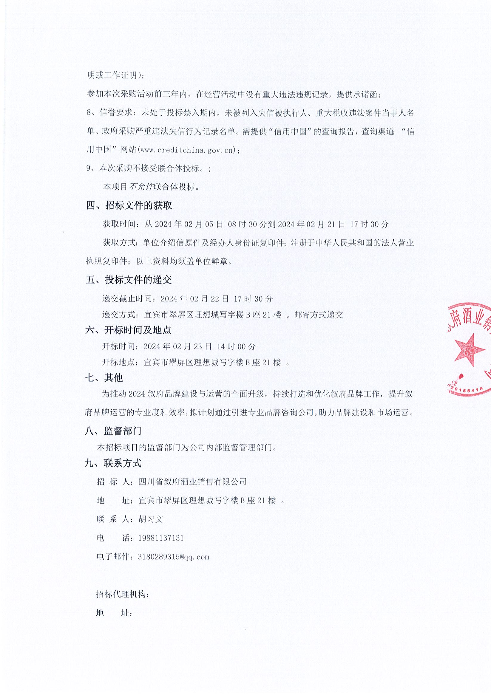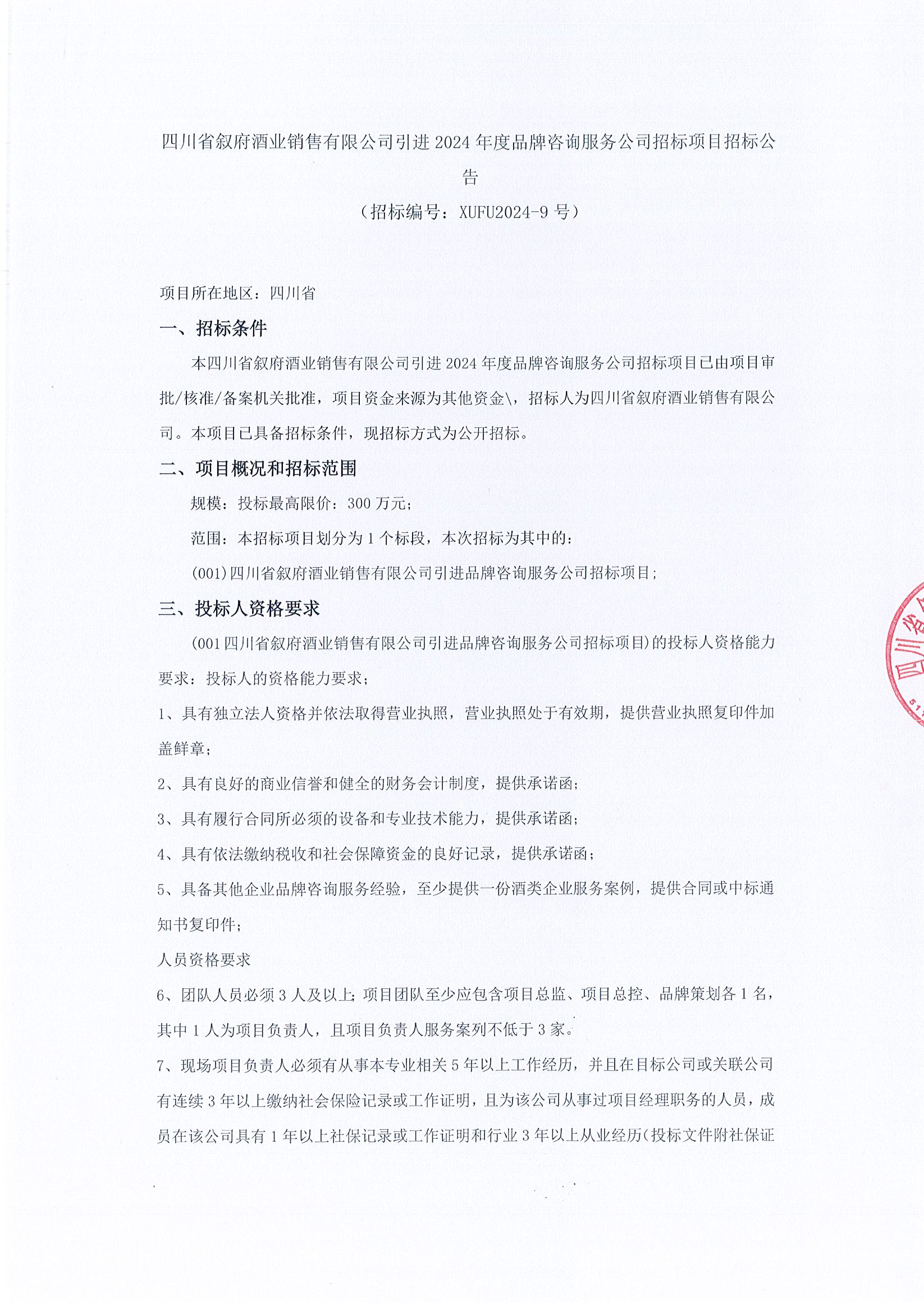 四川省敘府酒業(yè)銷(xiāo)售有限公司 引進(jìn)2024年度品牌咨詢(xún)服務(wù)公司 招標項目公告