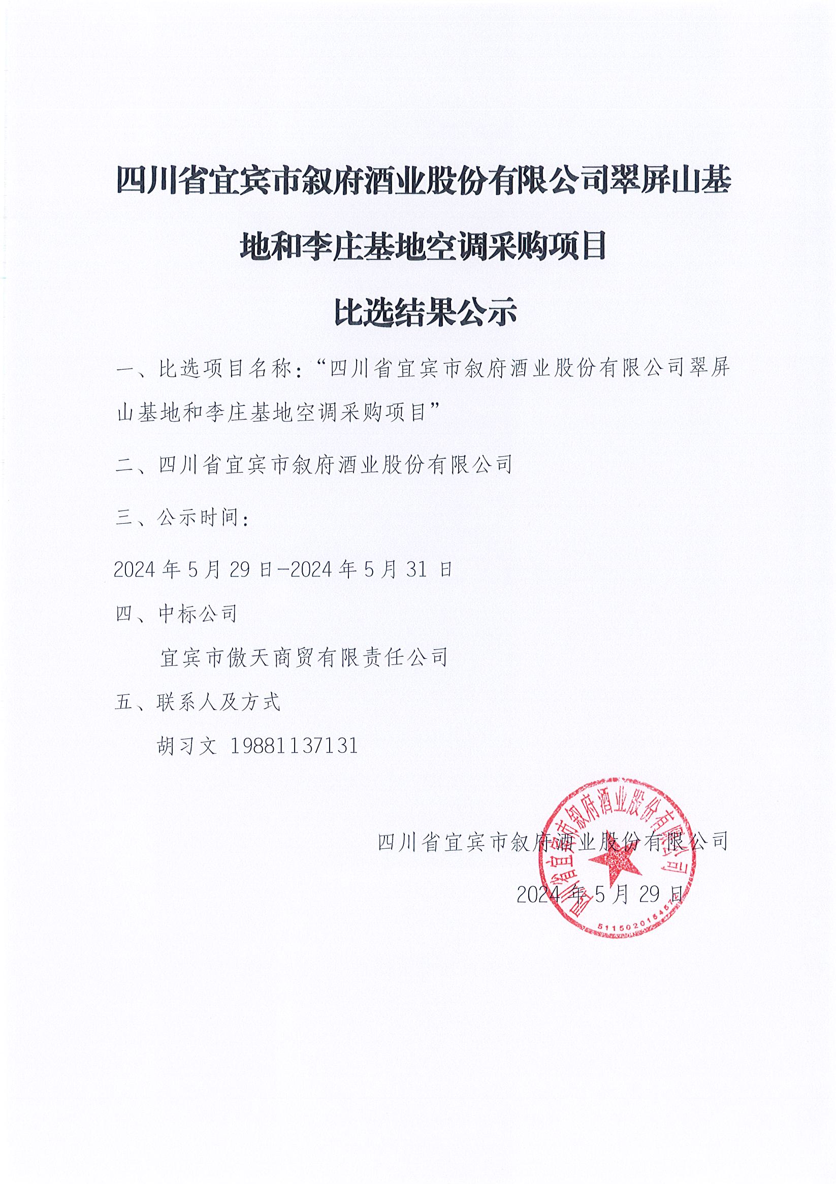 四川省宜賓市敘府酒業(yè)股份有限公司翠屏山基地和李莊基地空調采購項目延期開(kāi)標通知