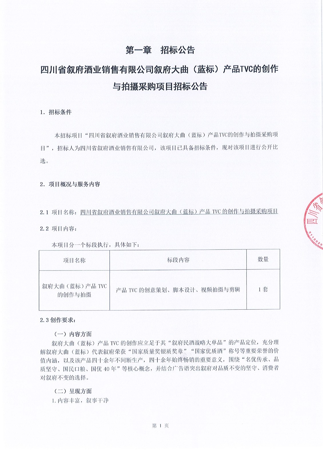 四川省敘府酒業(yè)銷(xiāo)售有限公司敘府大曲(藍標)產(chǎn)品TVC的創(chuàng )作與拍攝采購項目中標結果公示公告