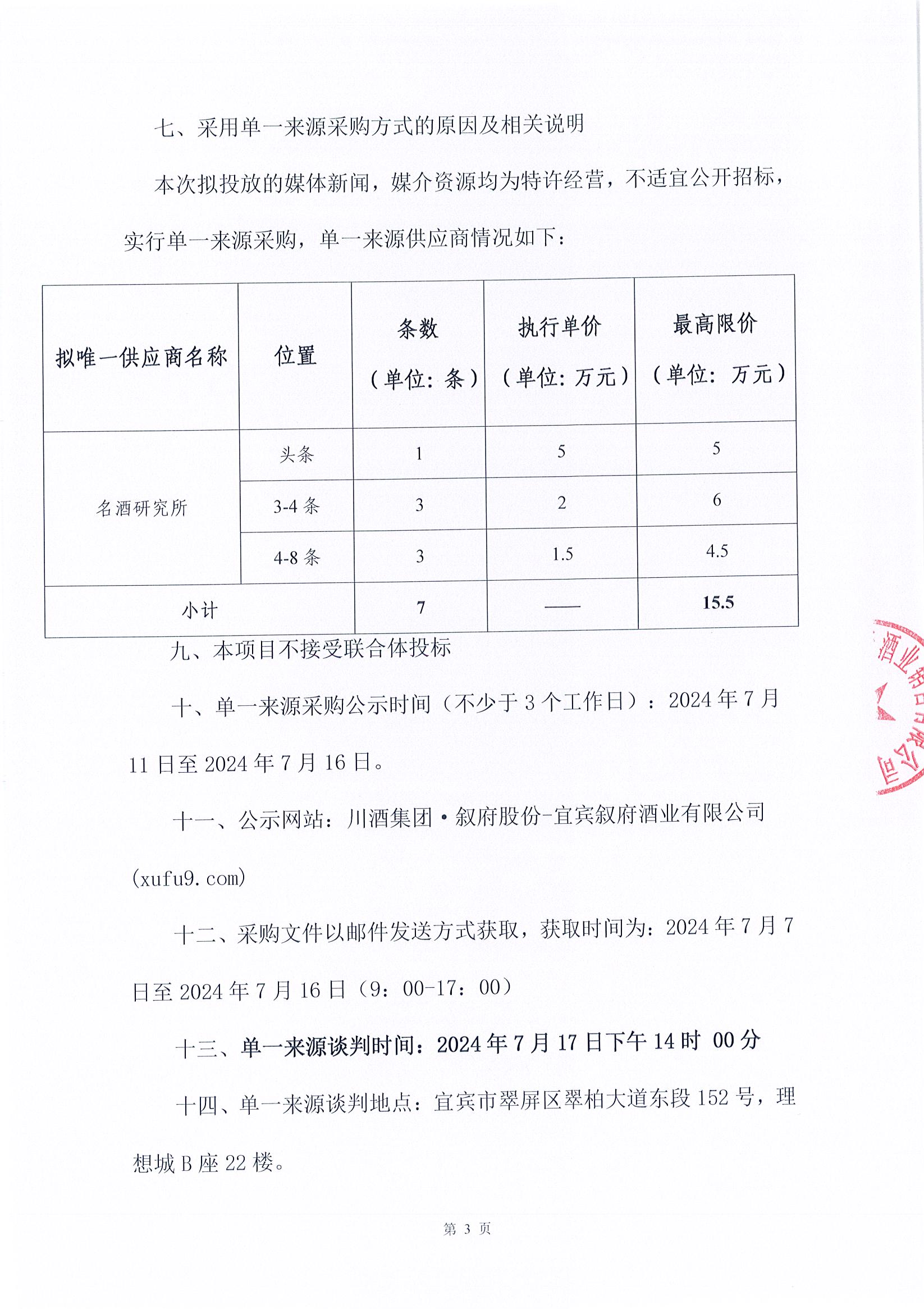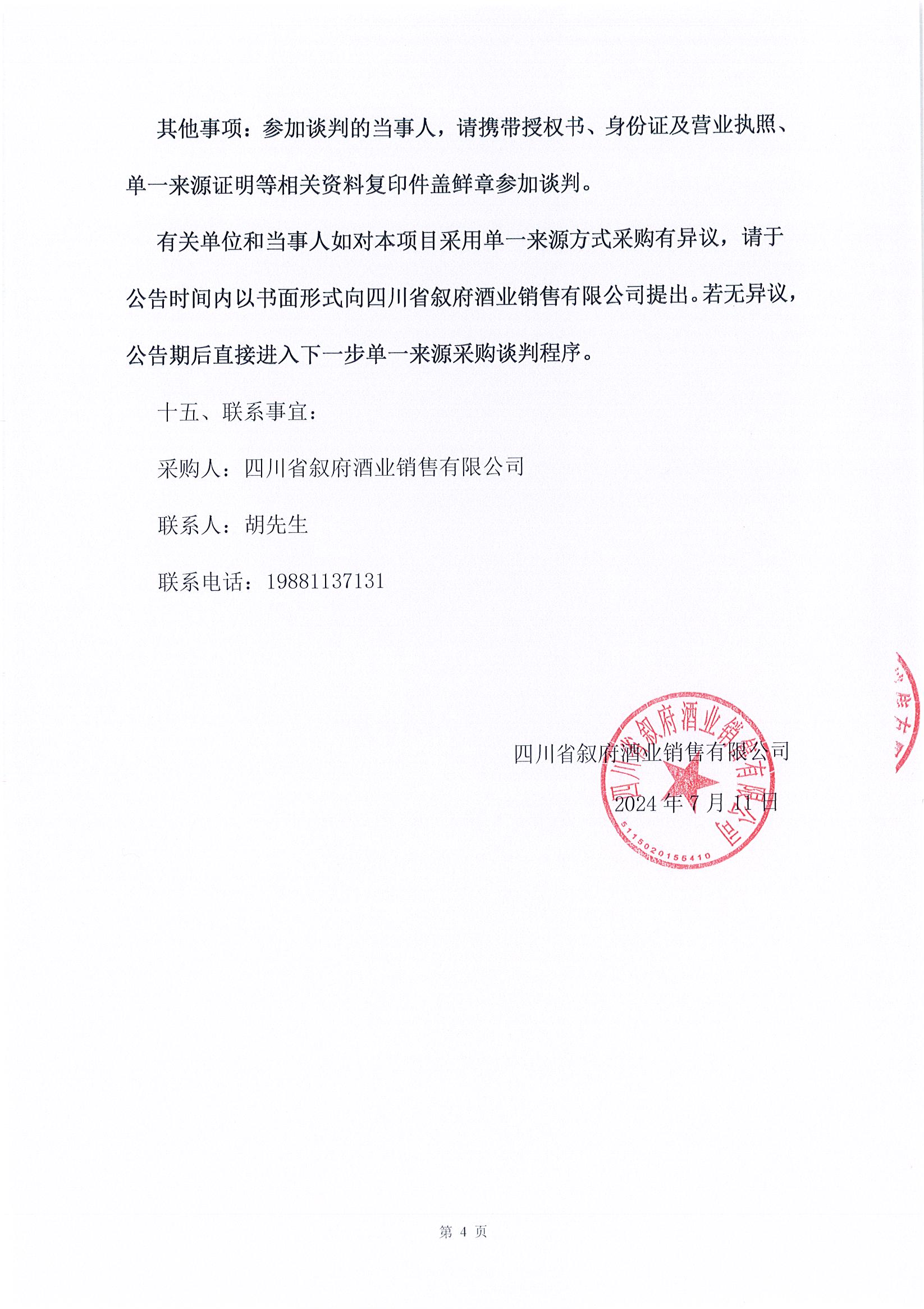 四川省敘府酒業(yè)銷(xiāo)售有限公司2024年度名酒研究所宣發(fā)資源單一來(lái)源采購項目公示公告