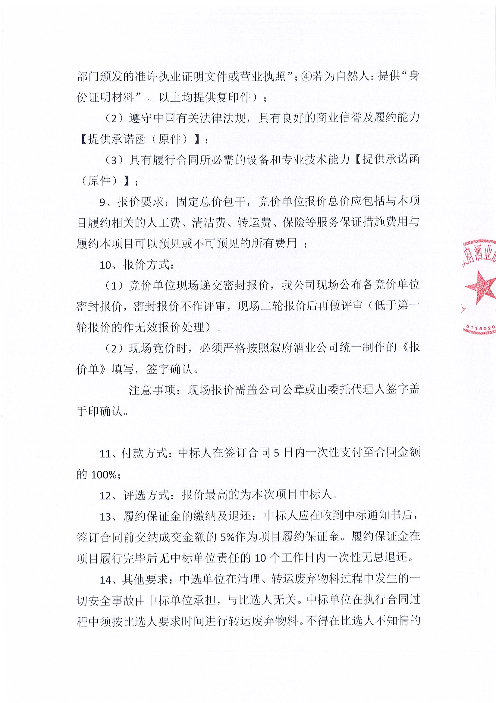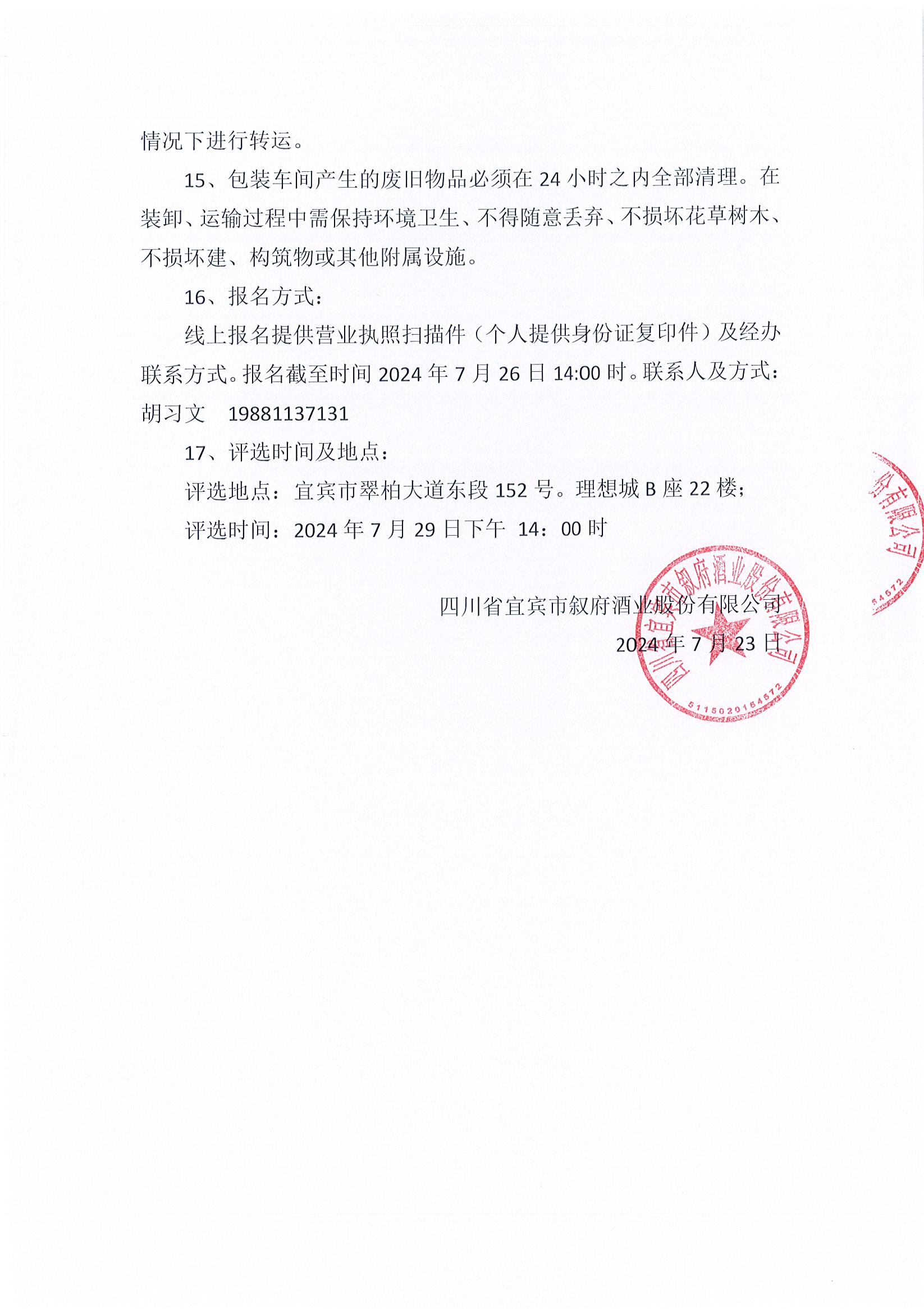 四川省宜賓市敘府酒業(yè)股份有限公司翠屏山廠(chǎng)區、李莊廠(chǎng)區2024年熱季檢修項目公開(kāi)比選公示公告