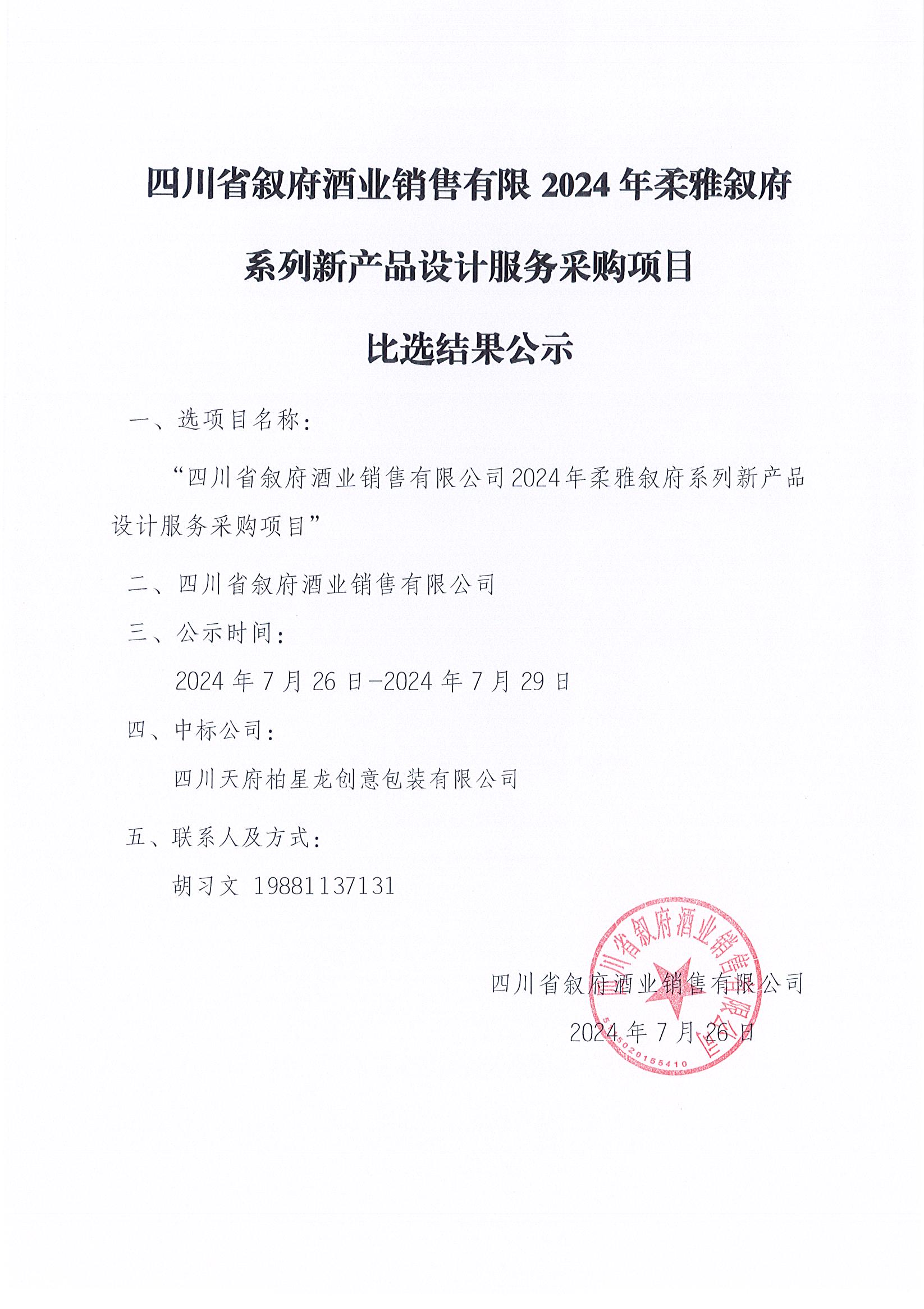 四川省敘府酒業(yè)銷(xiāo)售有限公司敘府大曲(藍標)產(chǎn)品TVC的創(chuàng )作與拍攝采購項目中標結果公示公告