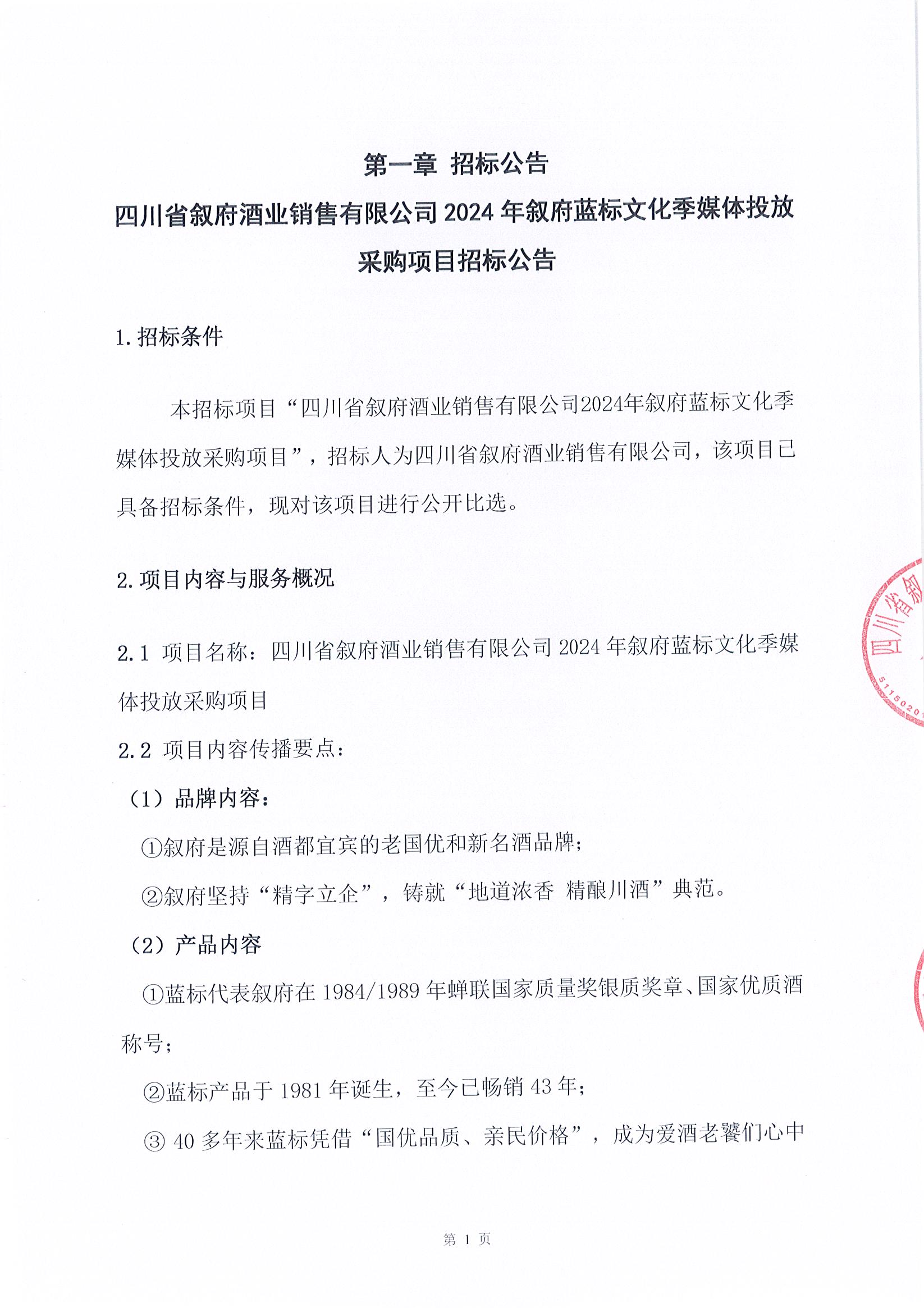 四川省敘府酒業(yè)銷(xiāo)售有限公司2024年敘府藍標文化季媒體投放采購項目比選結果公示公告