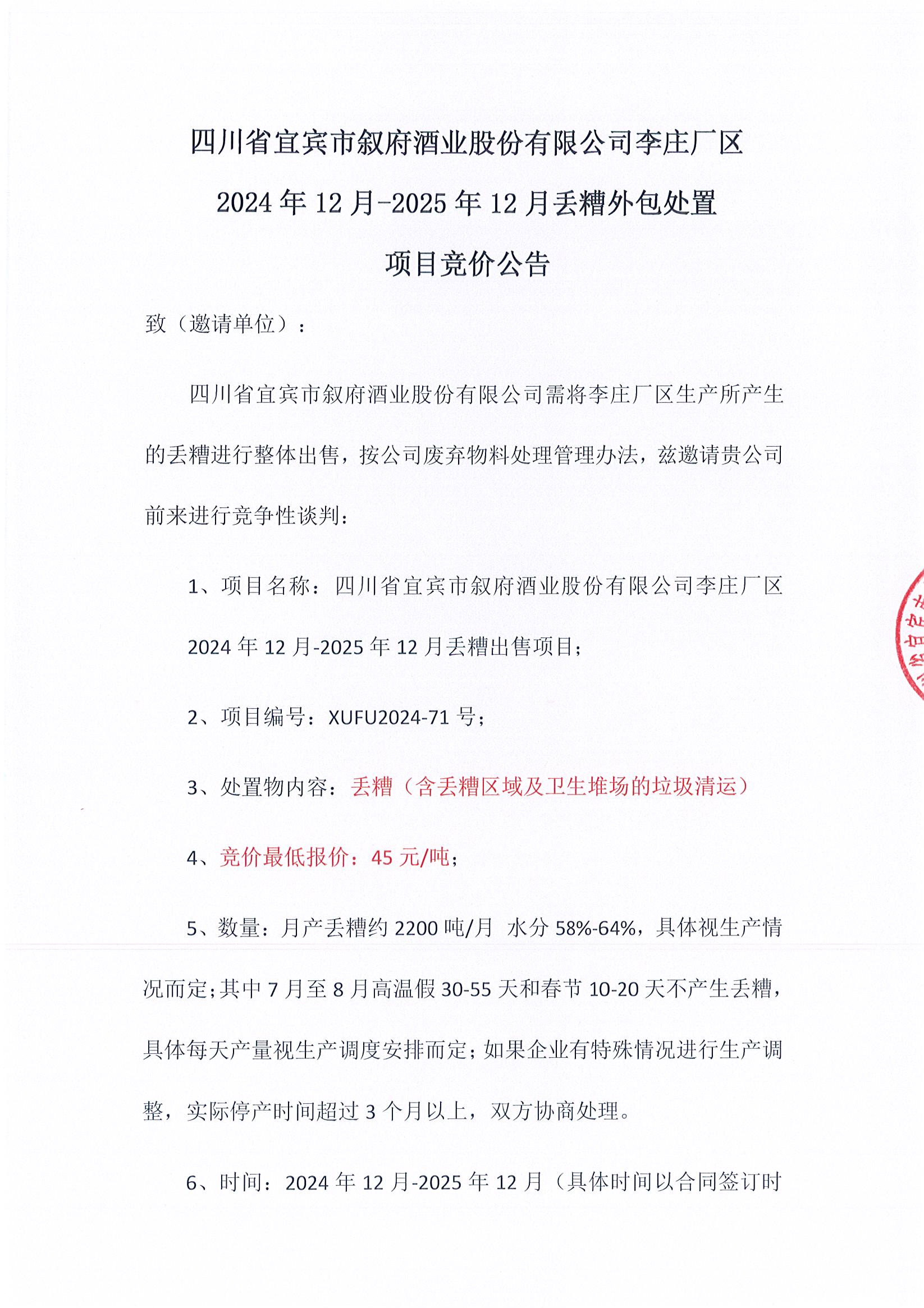 四川省宜賓市敘府酒業(yè)股份有限公司李莊廠(chǎng)區 2024年12月-2025年12月丟糟外包處置 項目競價(jià)公告