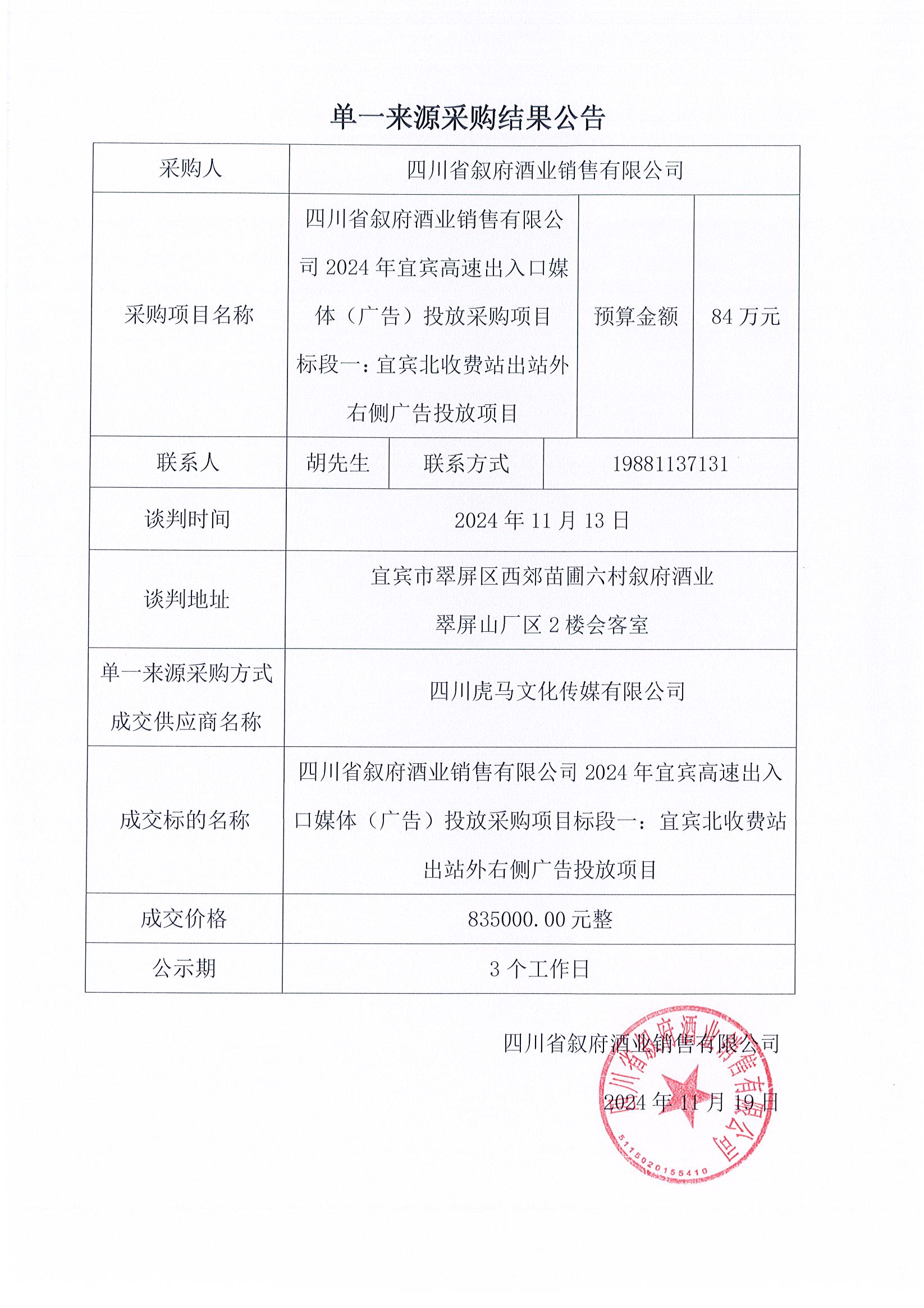 四川省宜賓市敘府酒業(yè)股份有限公司物流運輸服務(wù)采購項目比選結果公示