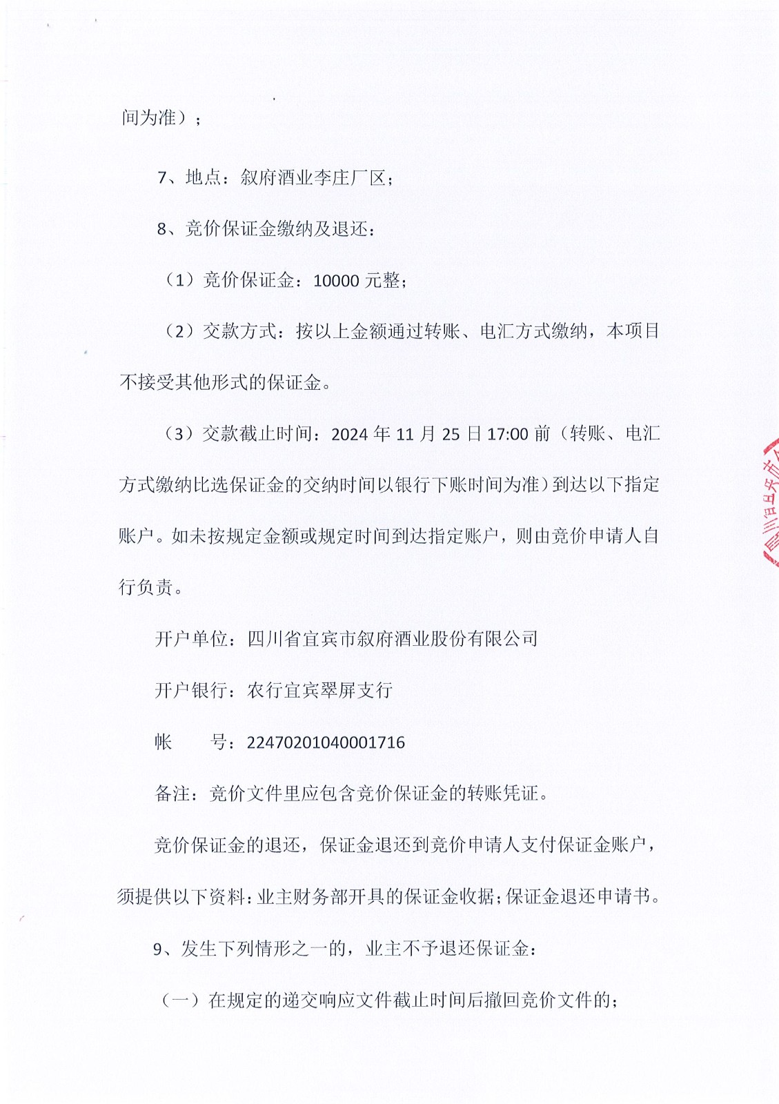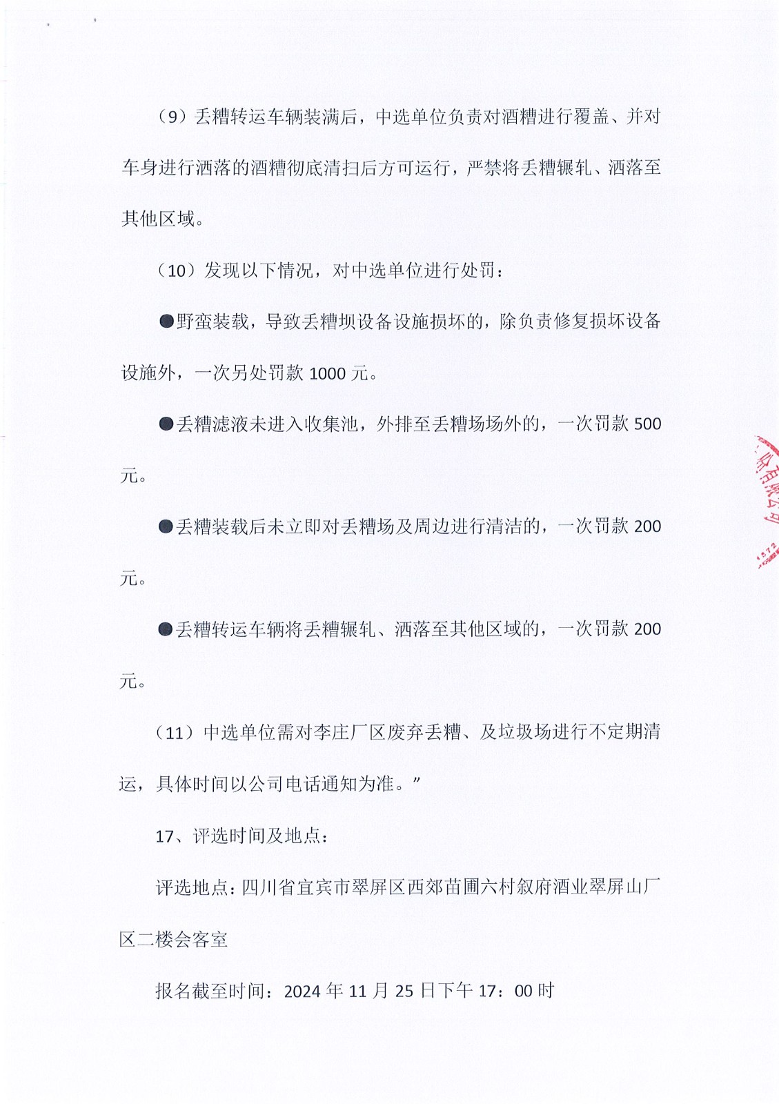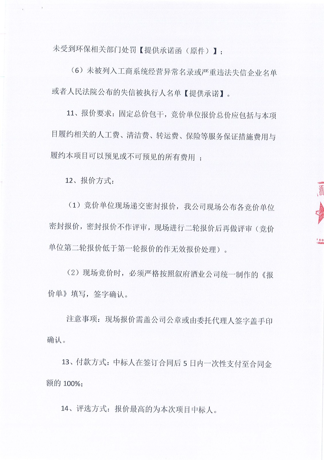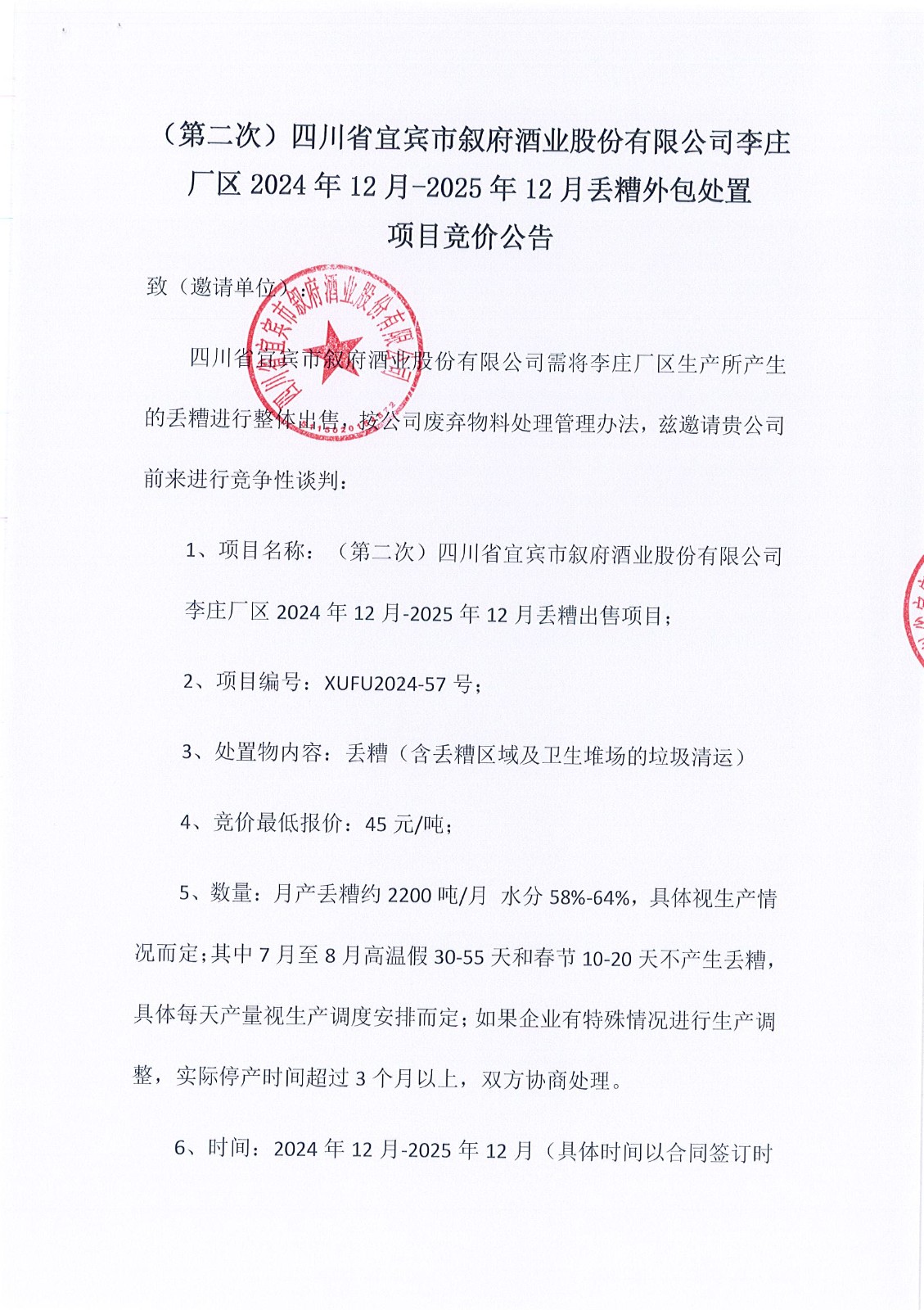 (第二次)四川省宜賓市敘府酒業(yè)股份有限公司李莊廠(chǎng)區2024年12月-2025年12月丟糟外包處置 項目競價(jià)公告