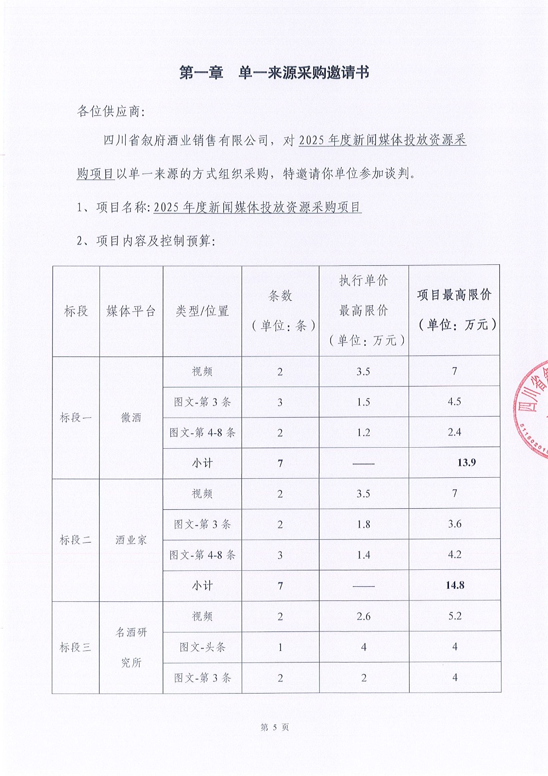 四川省敘府酒業(yè)銷(xiāo)售有限公司2025年度新聞媒體投放資源采購項目 單一來(lái)源采購公告