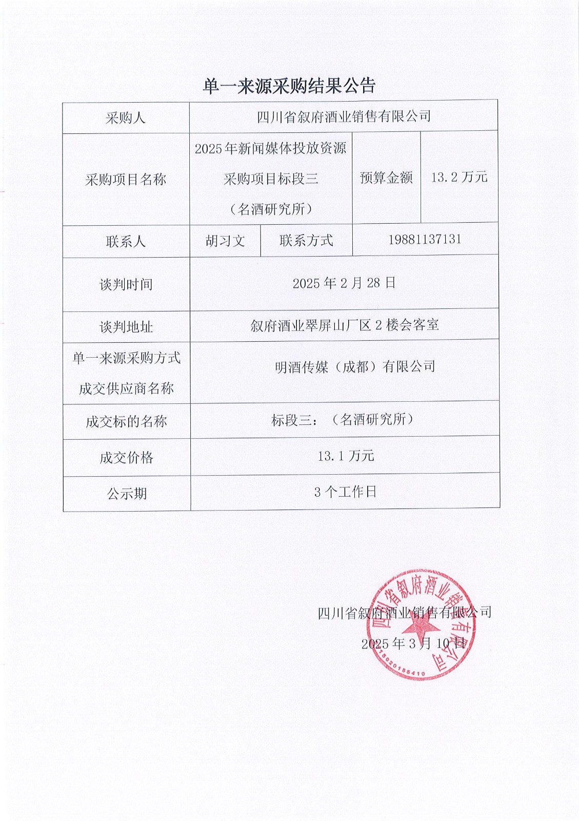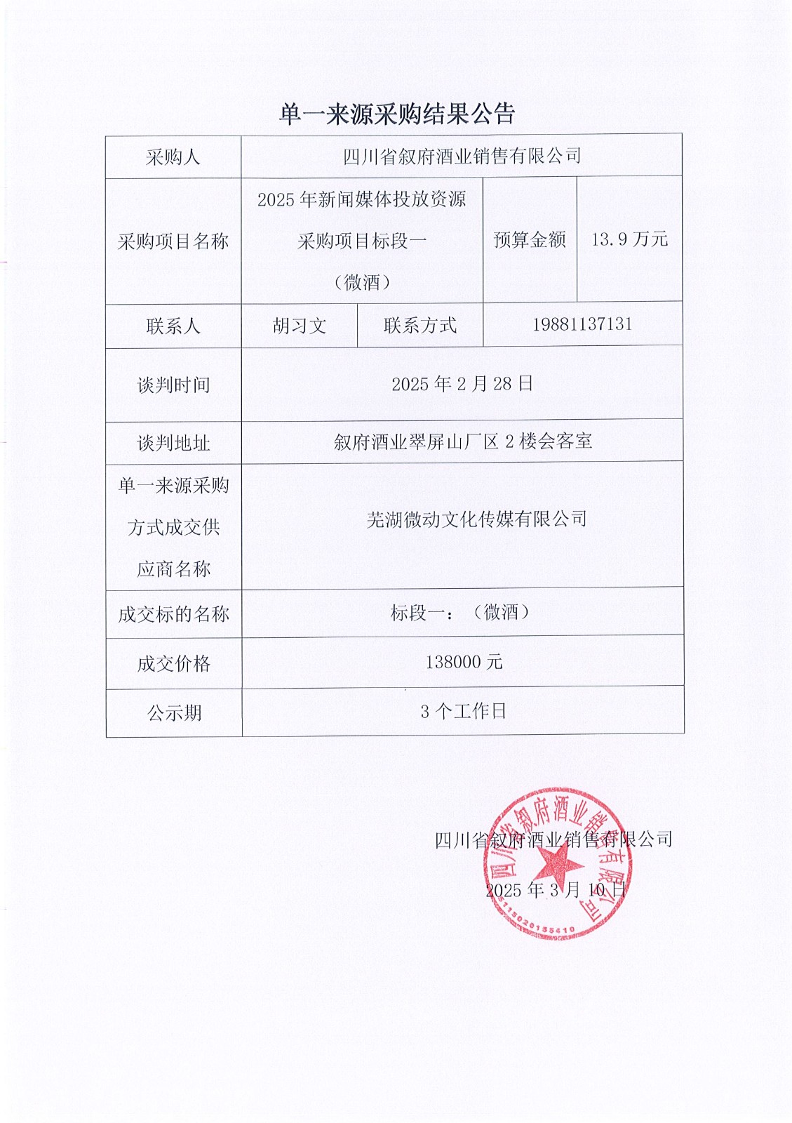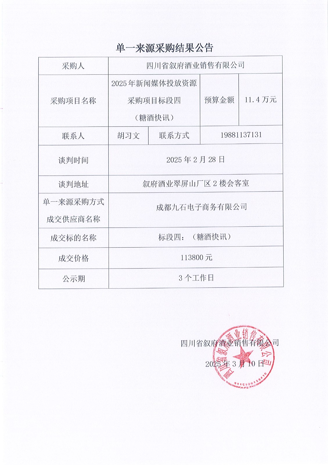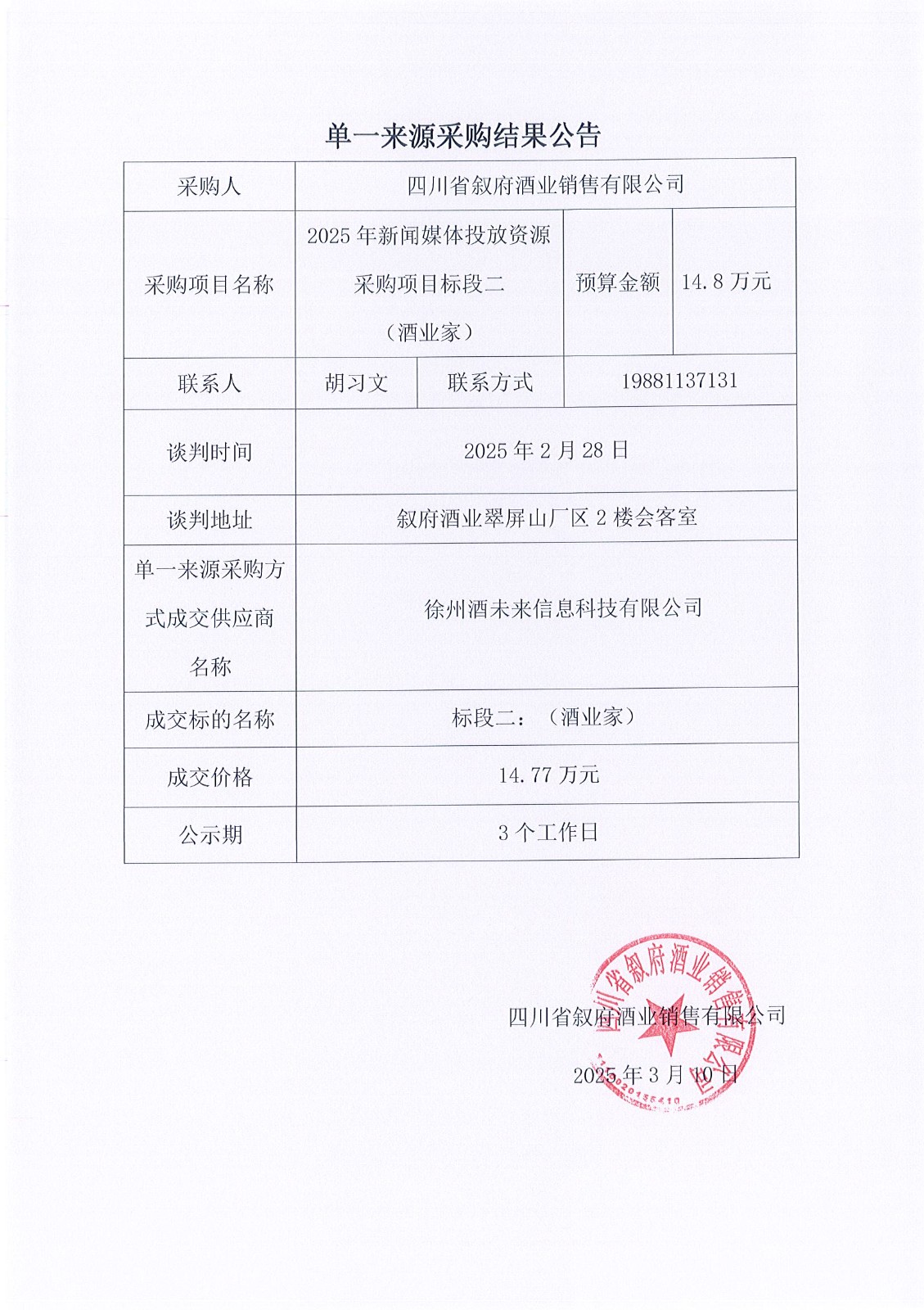 四川省敘府酒業(yè)銷(xiāo)售有限公司2025年度 新聞媒體投放資源采購項目單一來(lái)源各標段中標結果公示公告