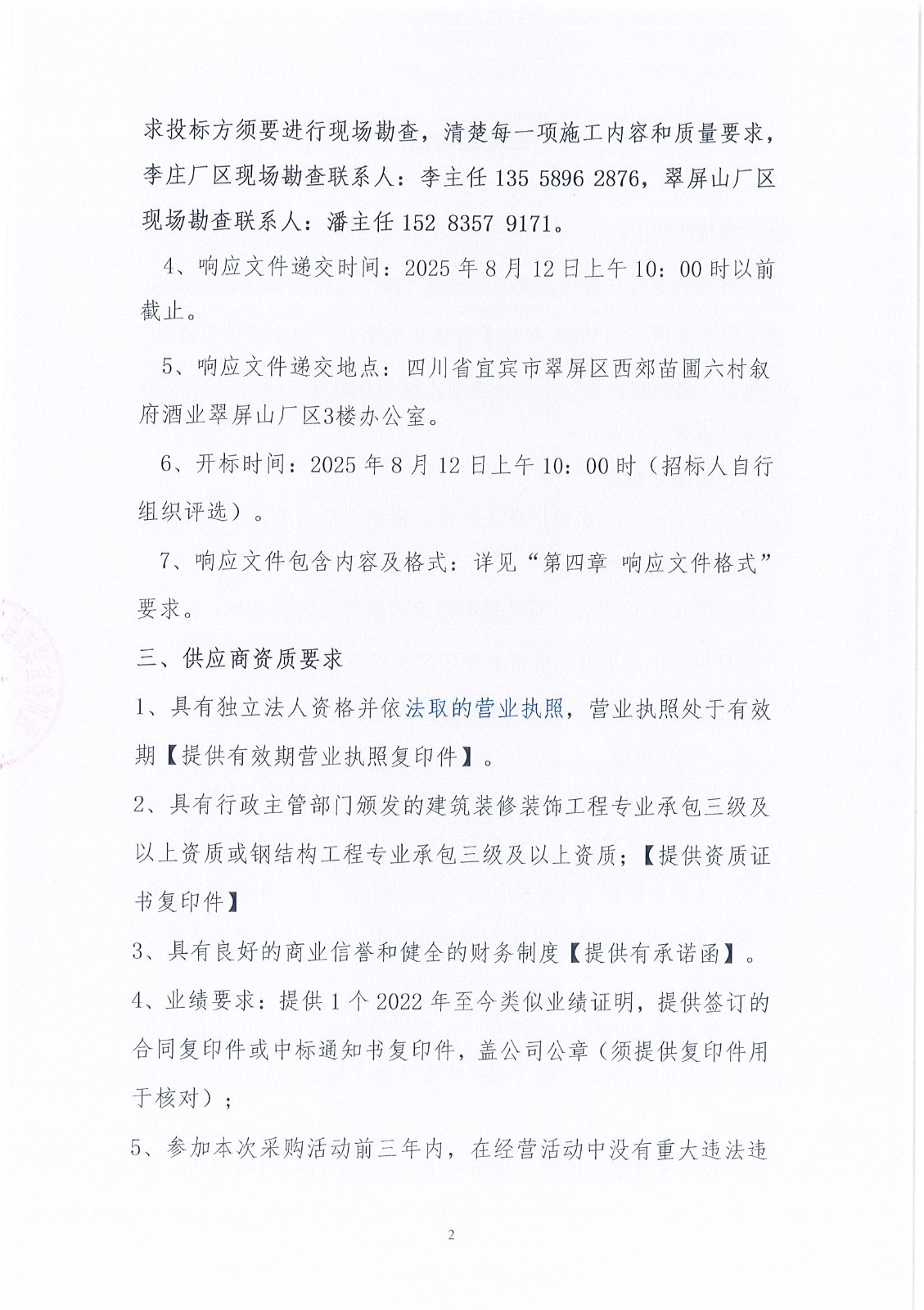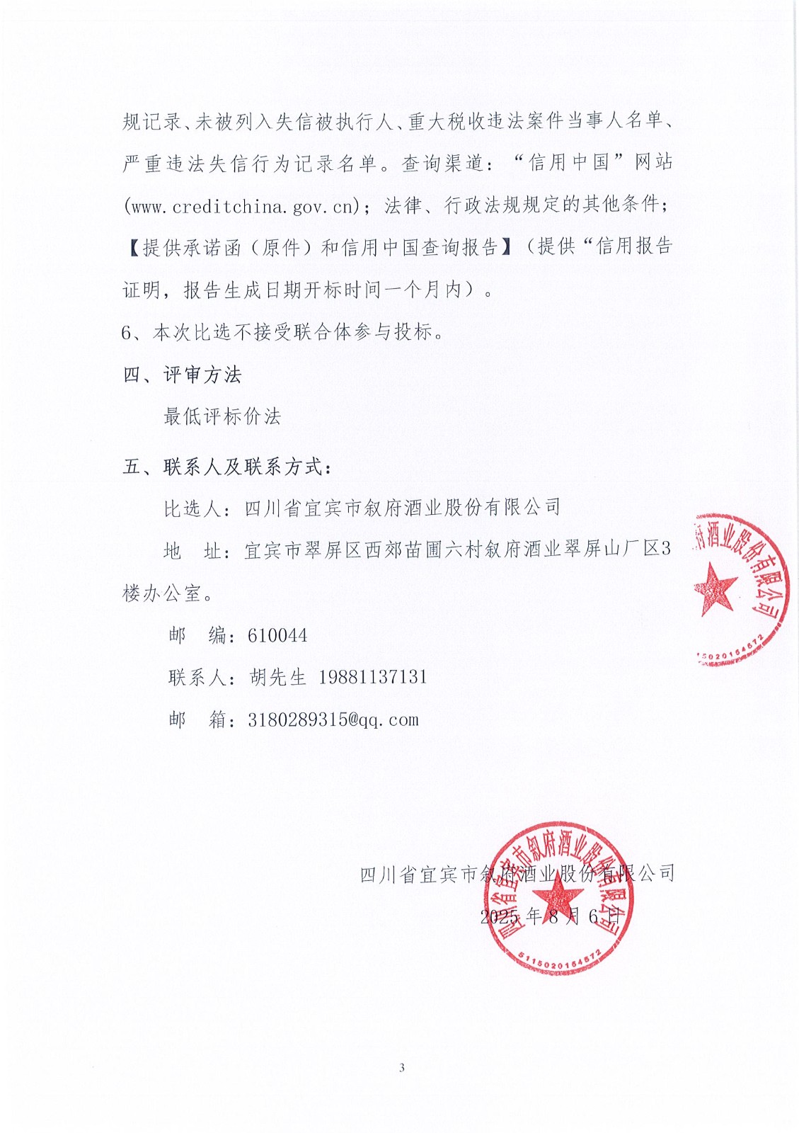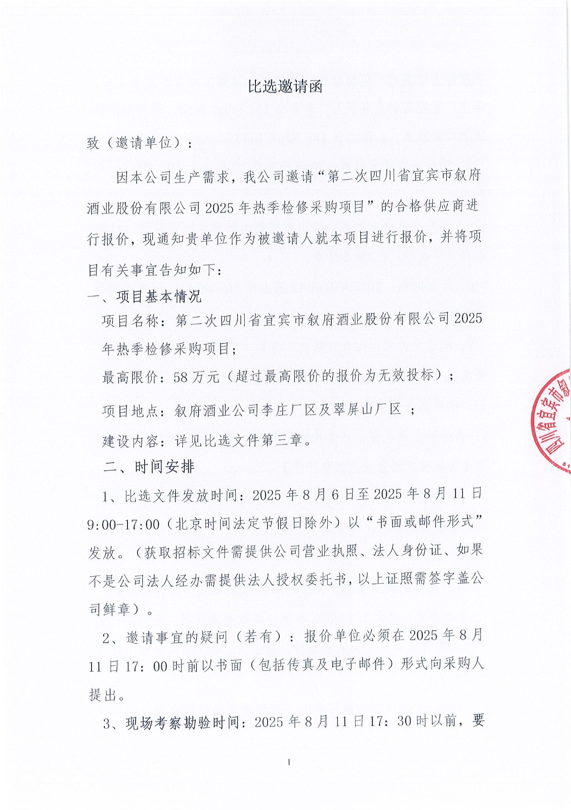 四川省宜賓市敘府酒業(yè)股份有限公司2025年熱季檢修項目流標公告