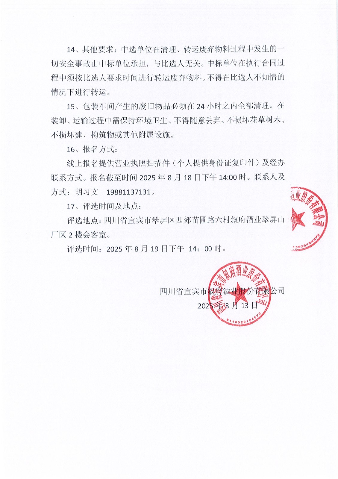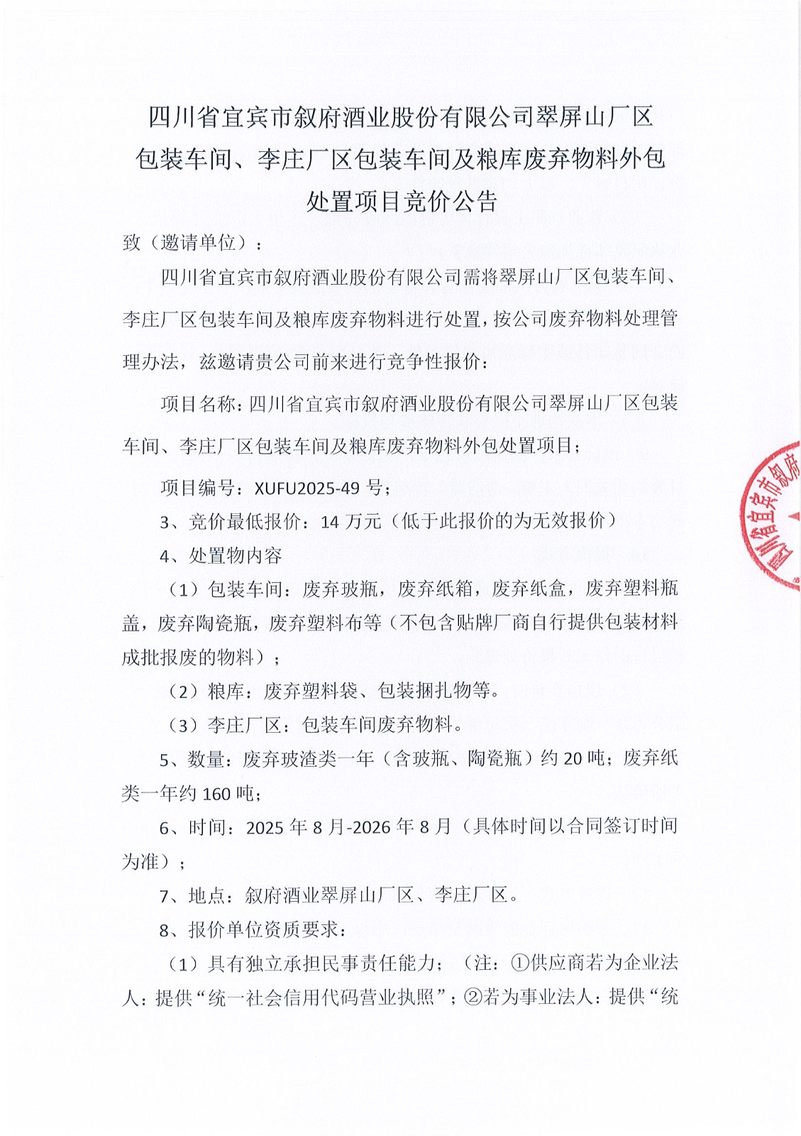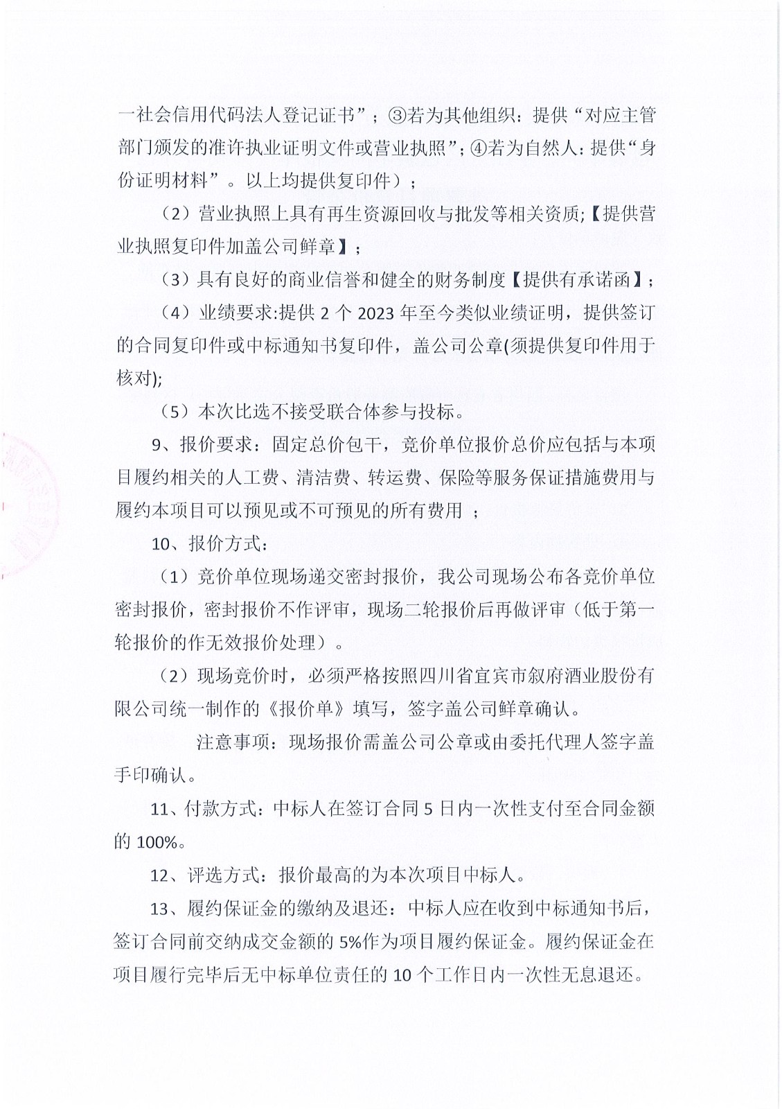 第二次四川省宜賓市敘府酒業(yè)股份有限公司熱季檢修李莊自動(dòng)化量水設備制安采購項目