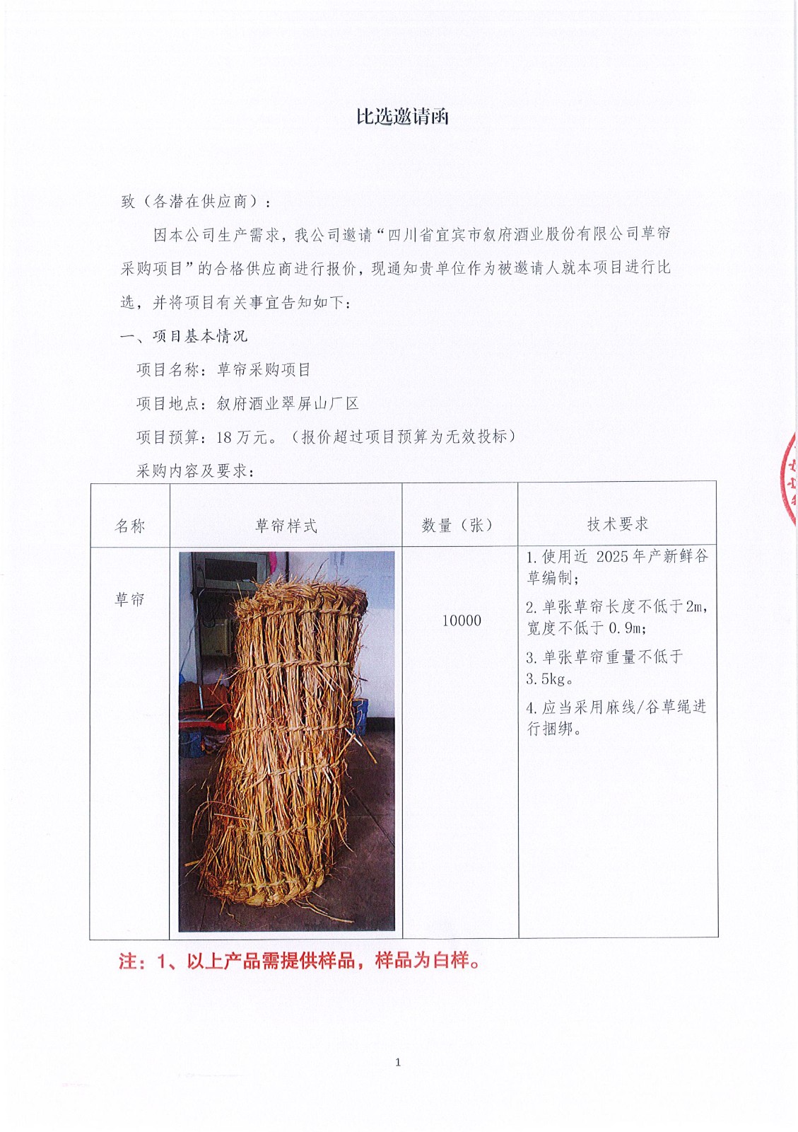 四川省宜賓市敘府酒業(yè)股份有限公司翠屏山廠(chǎng)2025-2026年度丟糟出售采購項目競價(jià)公告