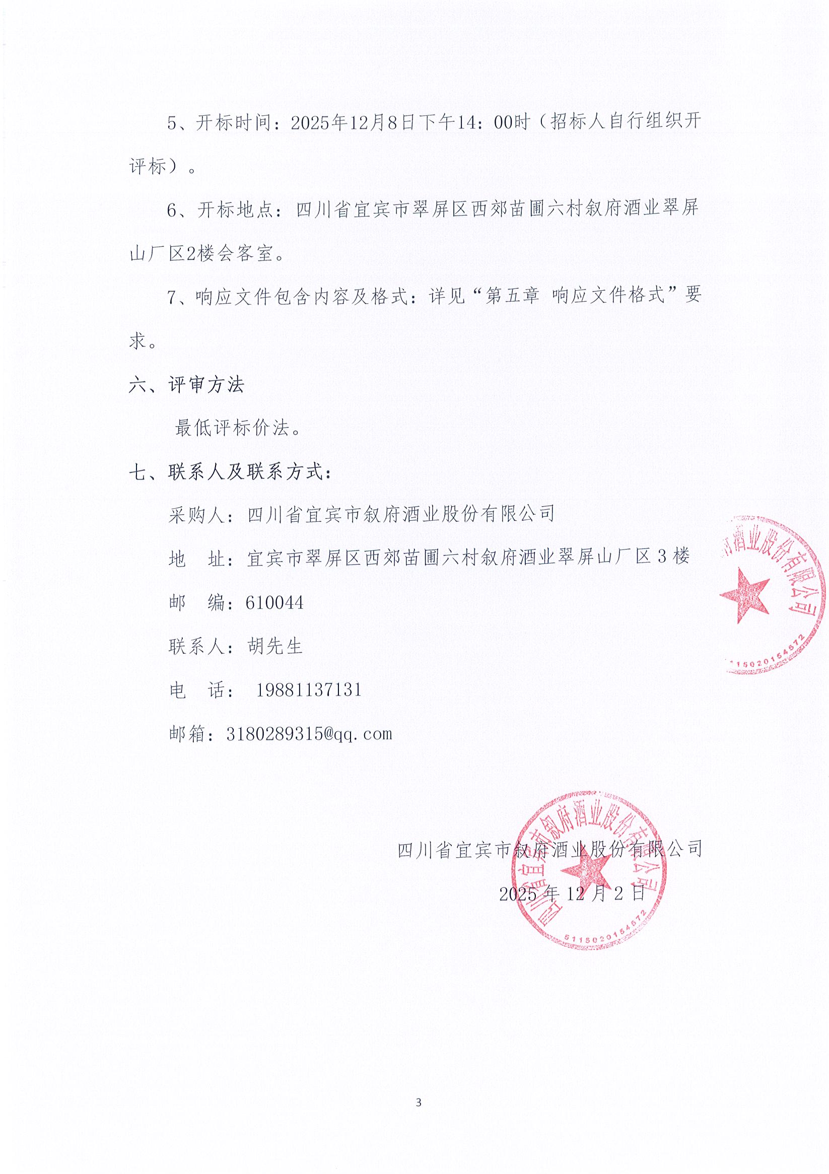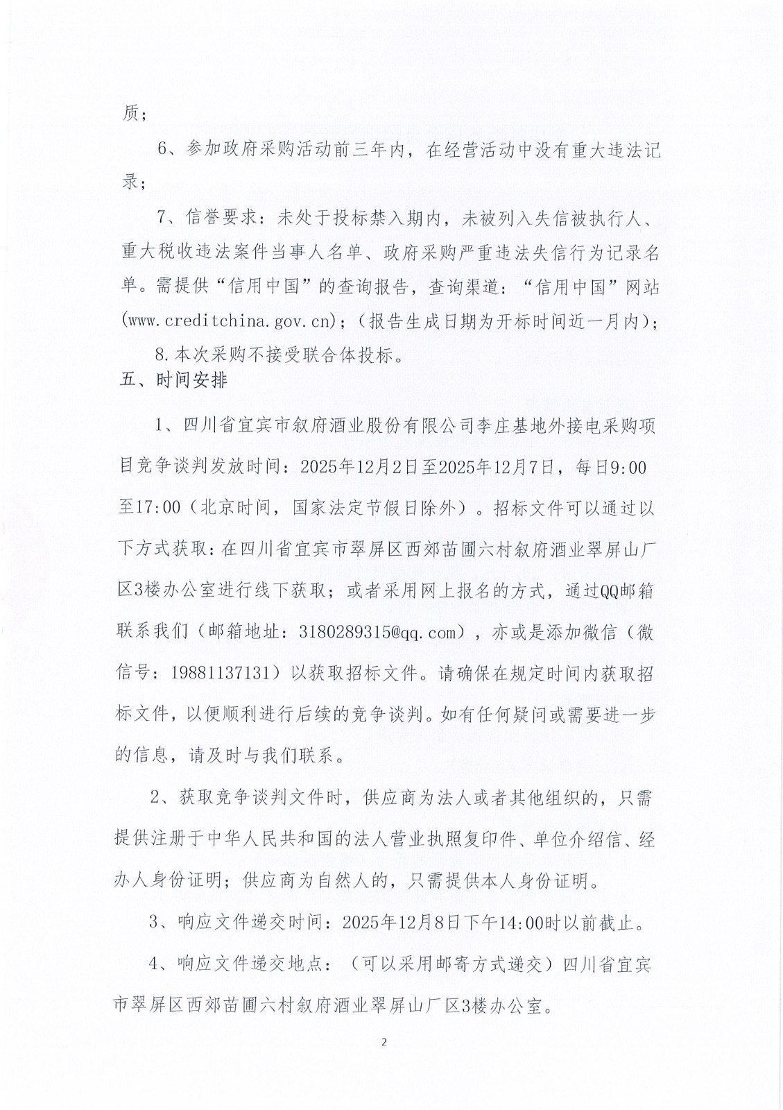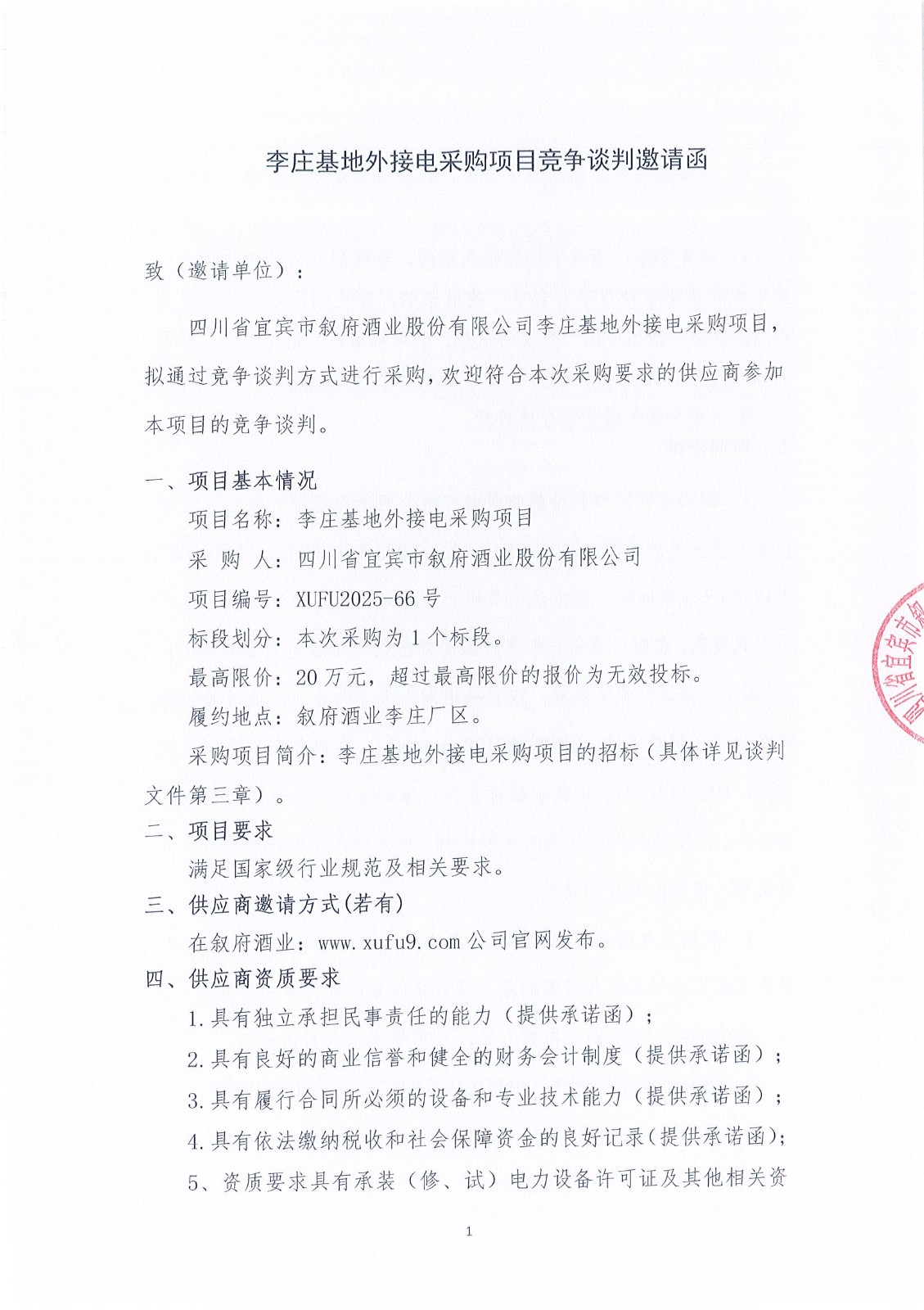 四川省宜賓市敘府酒業(yè)股份有限公司李莊基地外接電競爭談判采購項目