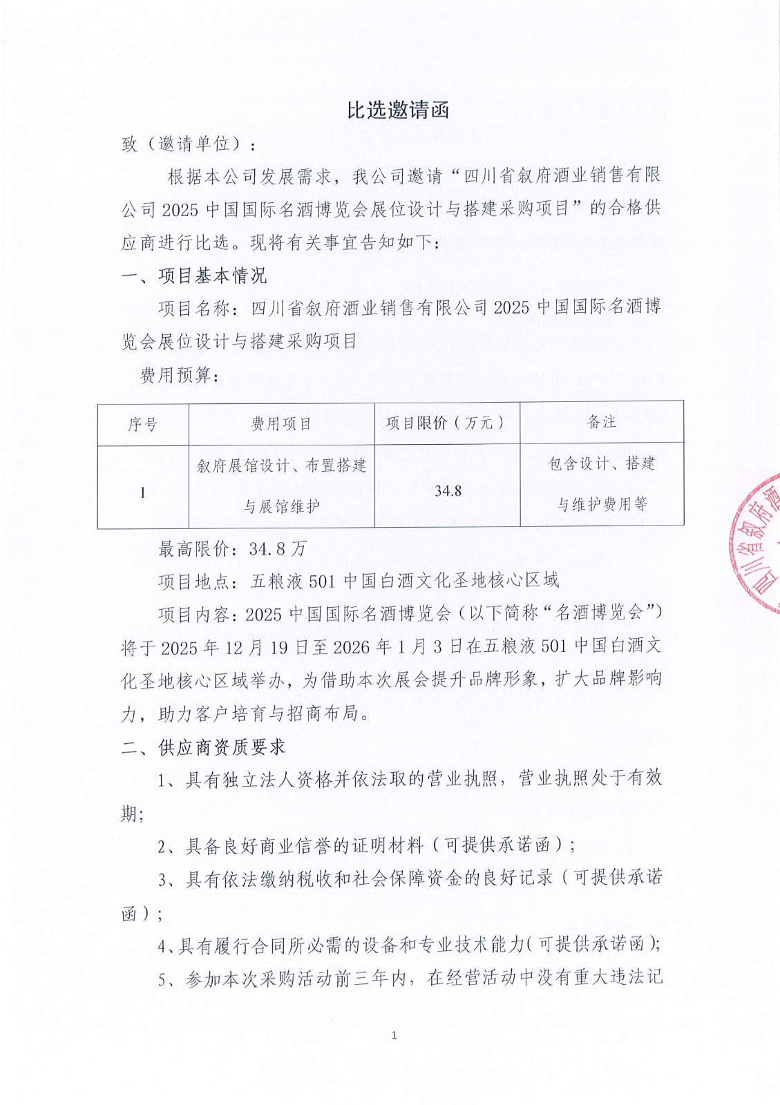 四川省宜賓市敘府酒業(yè)股份有限公司李莊基地外接電競爭談判采購項目