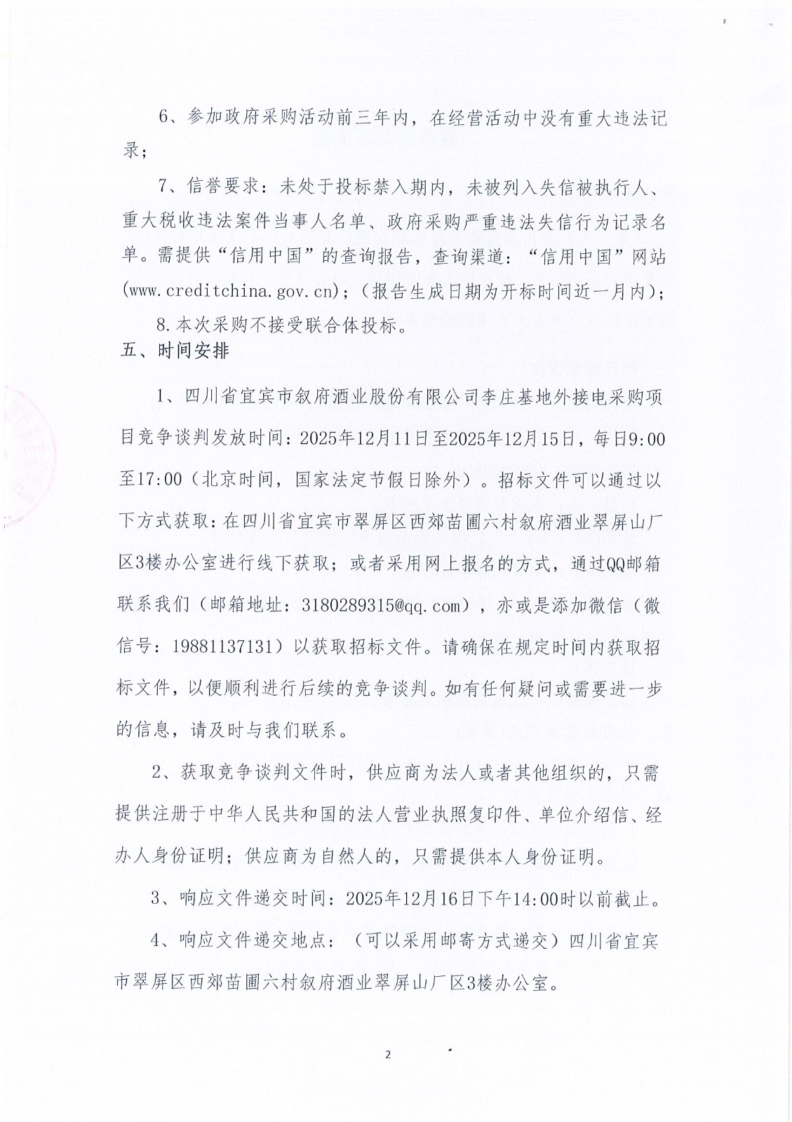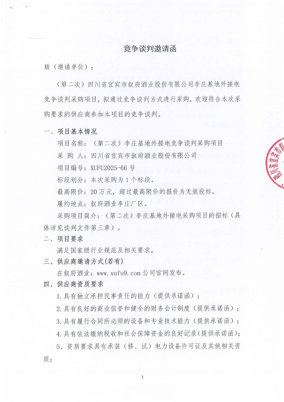 四川省宜賓市敘府酒業(yè)股份有限公司李莊基地外接電競爭談判采購項目流標(biāo)公示公告