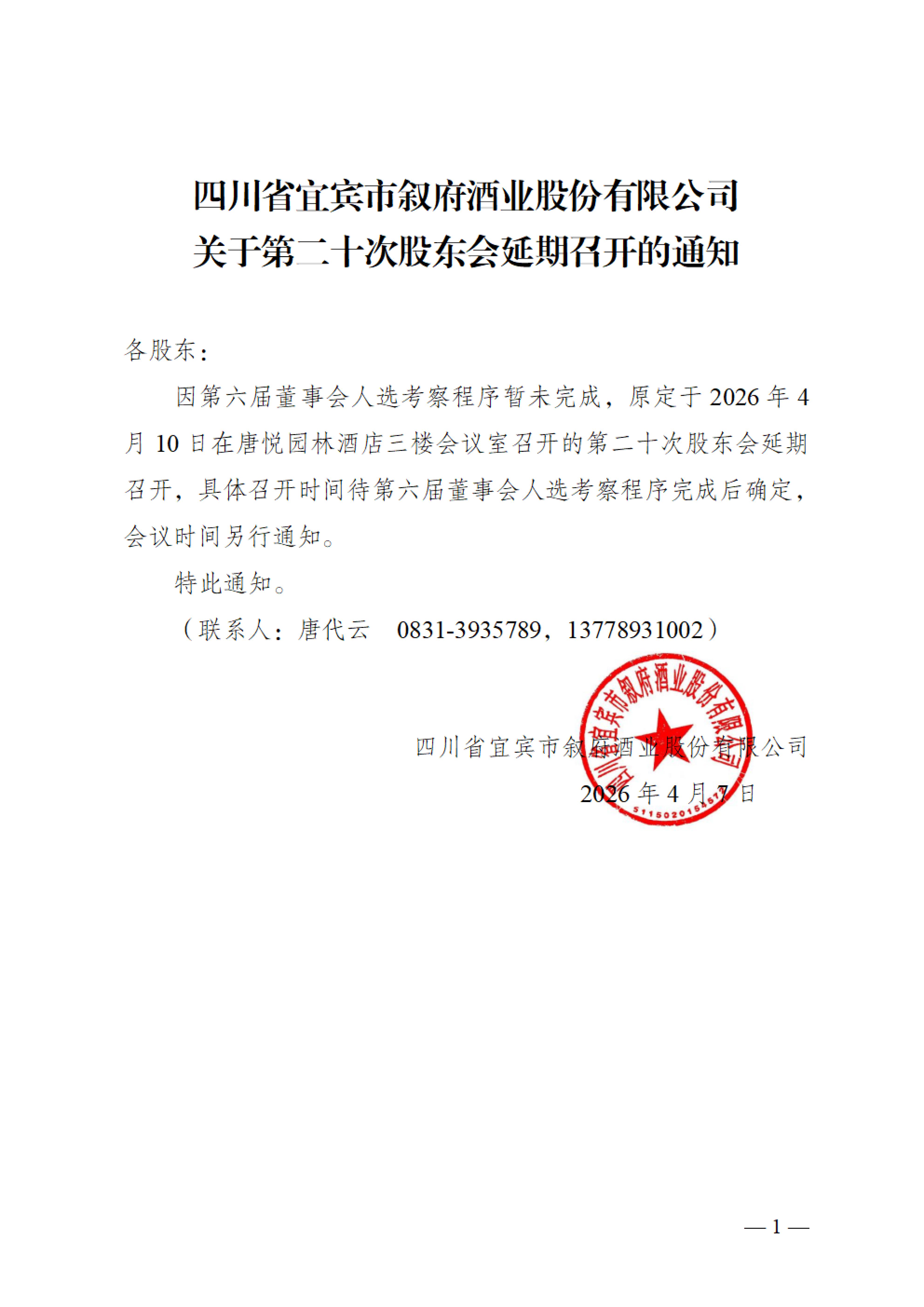 四川省宜賓市敘府酒業(yè)股份有限公司關(guān)于召開第二十次股東會(huì)的通知