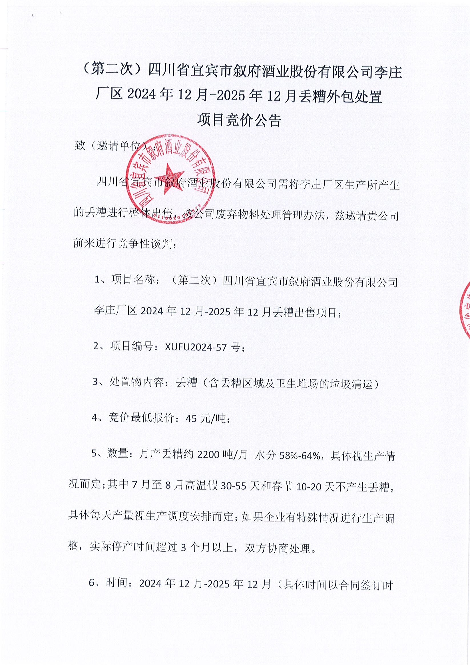 (第二次)四川省宜賓市敘府酒業(yè)股份有限公司李莊廠(chǎng)區2024年12月-2025年12月丟糟外包處置項目競價(jià)公告