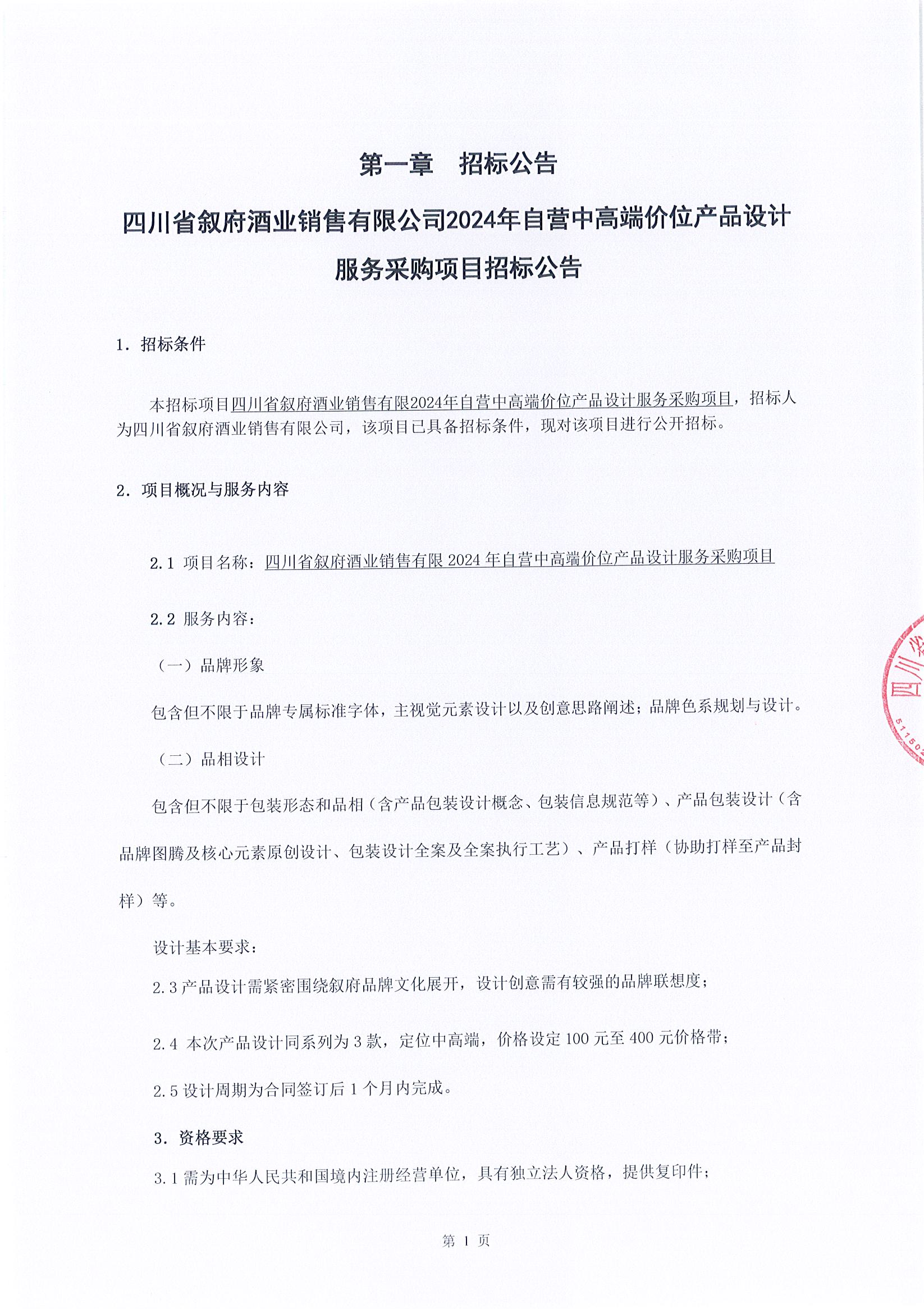 四川省敘府酒業(yè)銷(xiāo)售有限公司 2024年自營(yíng)中高端價(jià)位產(chǎn)品設計服務(wù)采購項目招標公告