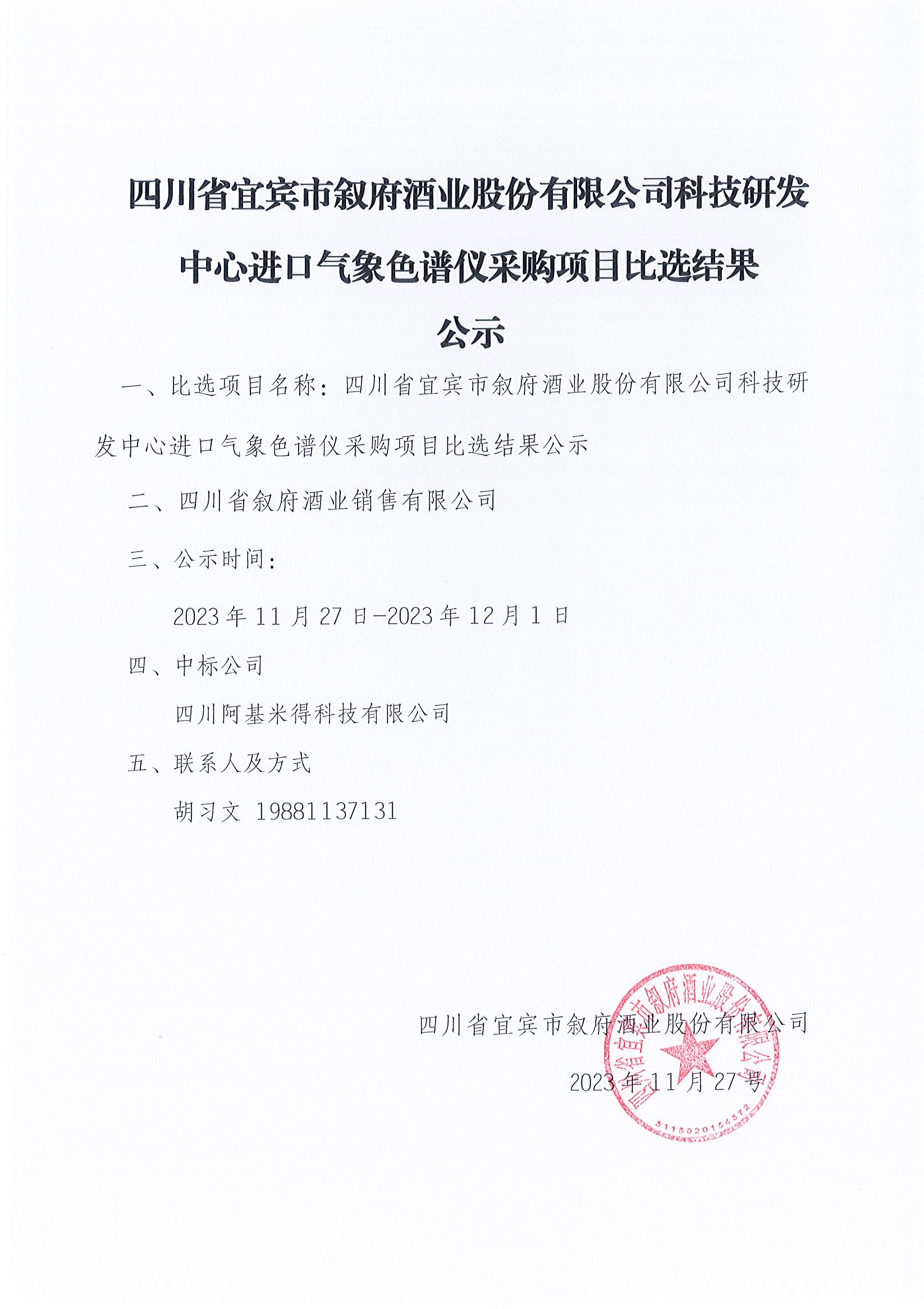 四川省宜賓市敘府酒業(yè)股份有限公司科技研發(fā)中心進(jìn)口氣相色譜儀采購項目--開(kāi)標結果公告