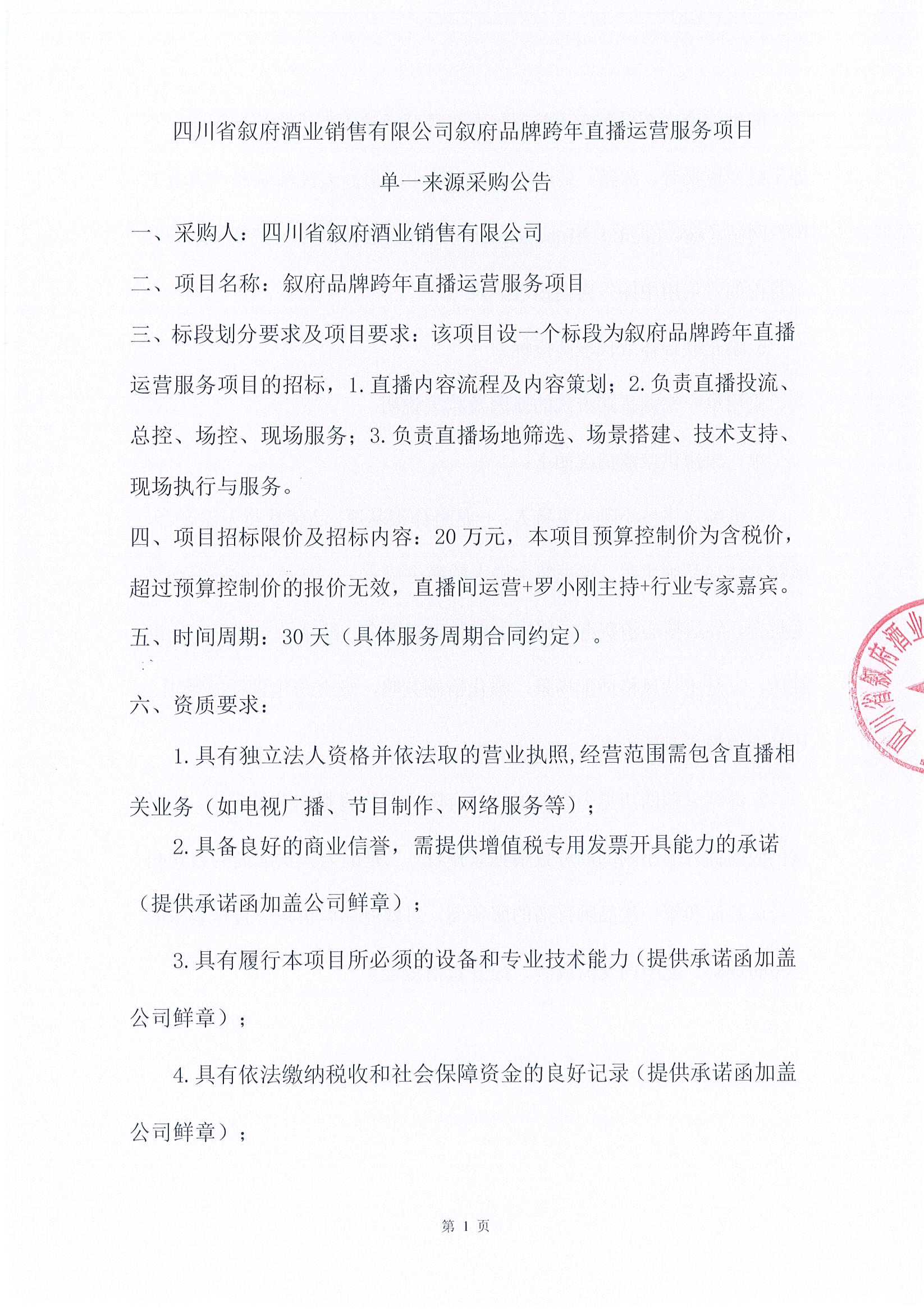 四川省敘府酒業(yè)銷(xiāo)售有限公司敘府品牌跨年直播運(yùn)營(yíng)服務(wù)項(xiàng)目單一來(lái)源招標(biāo)公告
