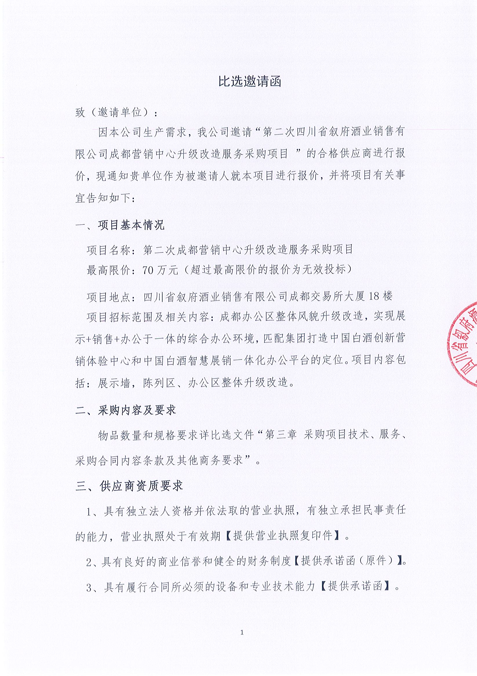 第二次四川省敘府酒業(yè)銷(xiāo)售有限公司成都營(yíng)銷(xiāo)中心升級改造服務(wù)采購項目公開(kāi)比選招標公告