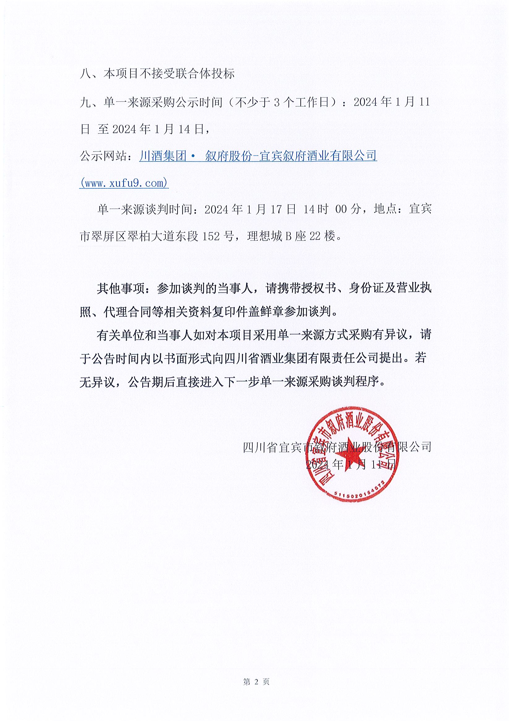 四川省宜賓市敘府酒業(yè)股份有限公司 2024年春季糖酒會(huì )(成都泰合國際大飯店)場(chǎng)地租賃公示公告