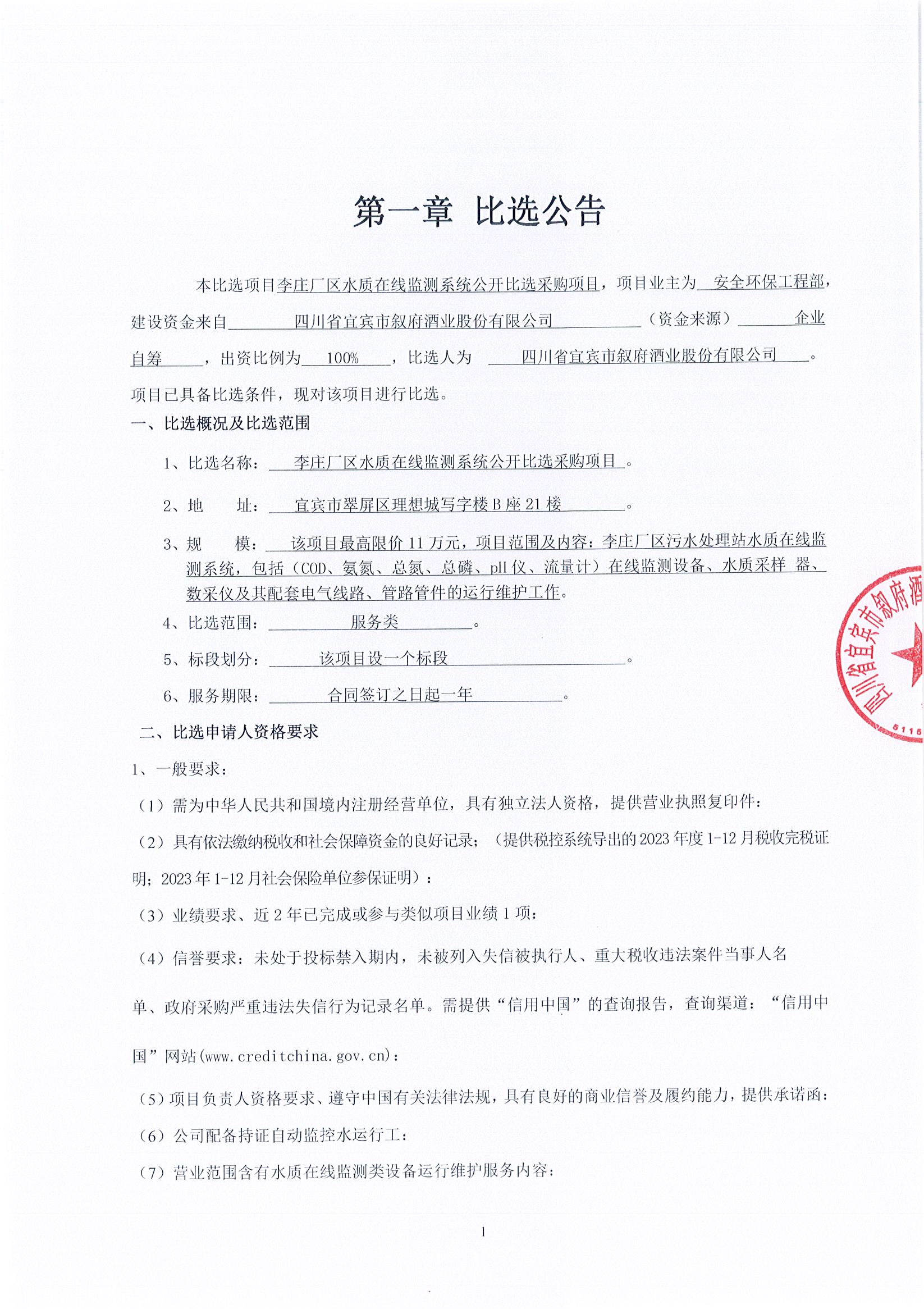 李莊廠(chǎng)區水質(zhì)在線(xiàn)監測系統公開(kāi)比選采購項目公開(kāi)比選公示公告