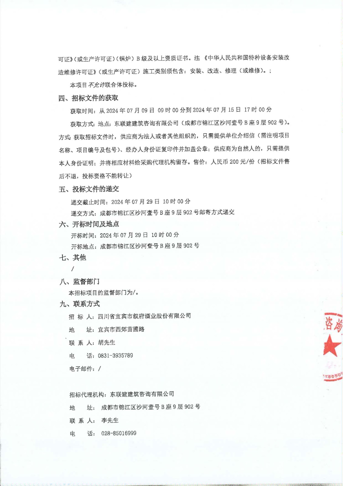 四川省宜賓市敘府酒業(yè)股份有限公司燃氣鍋爐低氮排放改造項目更正公告