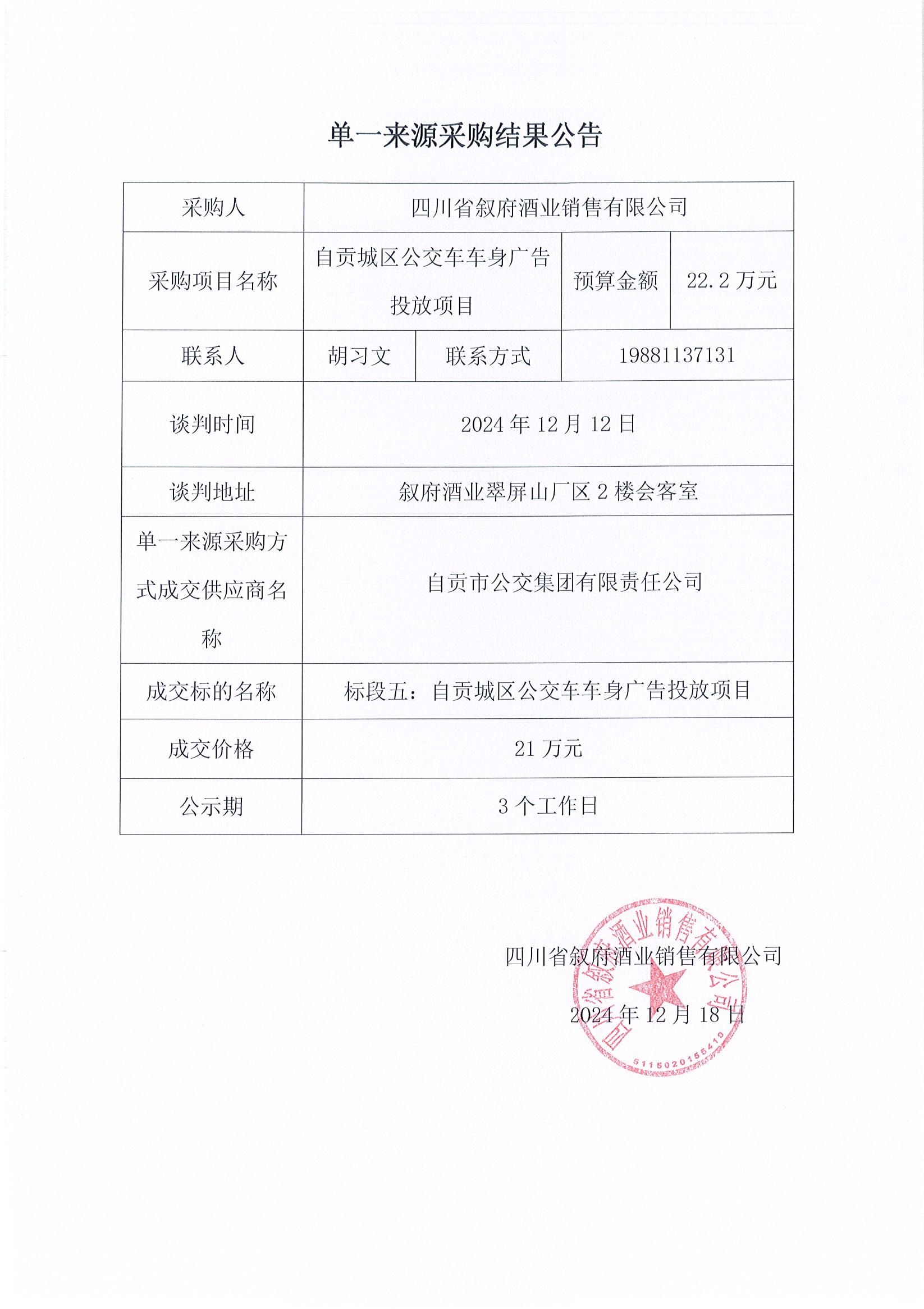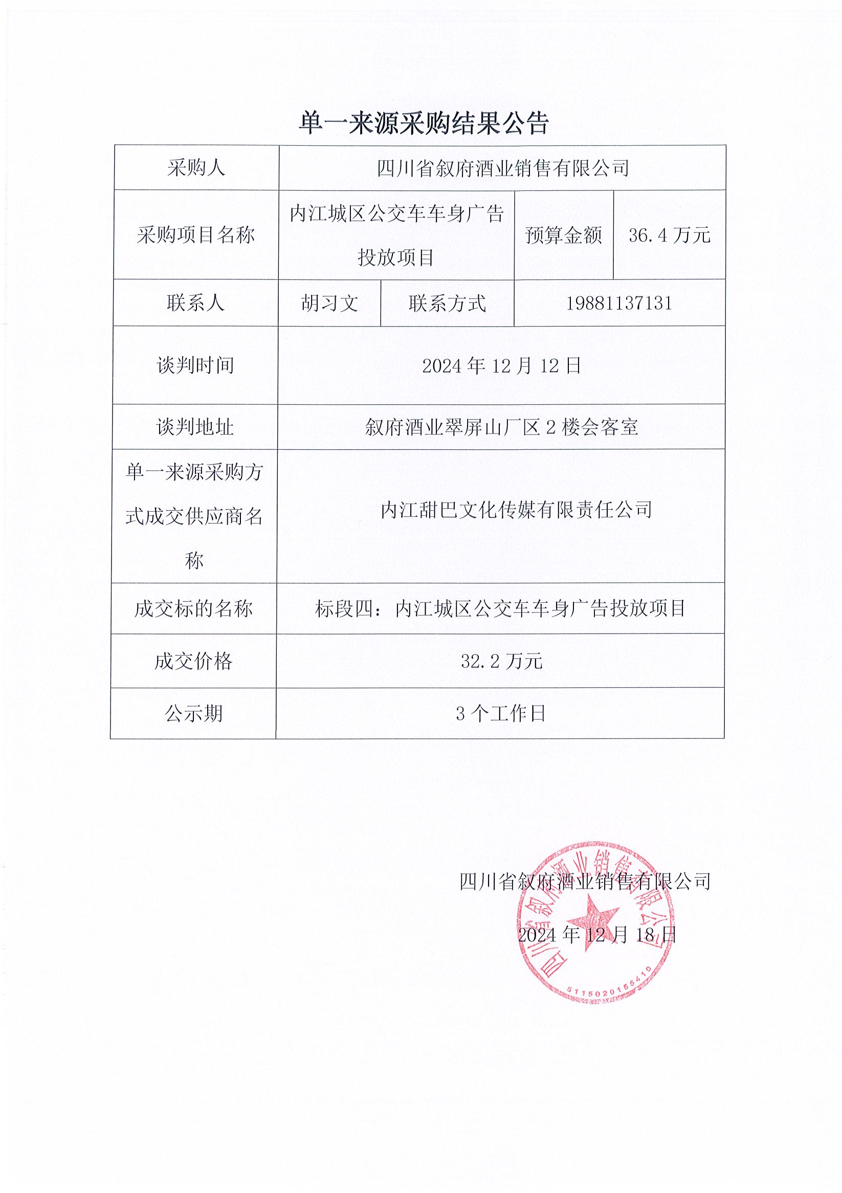 四川省敘府酒業(yè)銷(xiāo)售有限公司敘府大曲(藍標)產(chǎn)品TVC的創(chuàng )作與拍攝采購項目中標結果公示公告